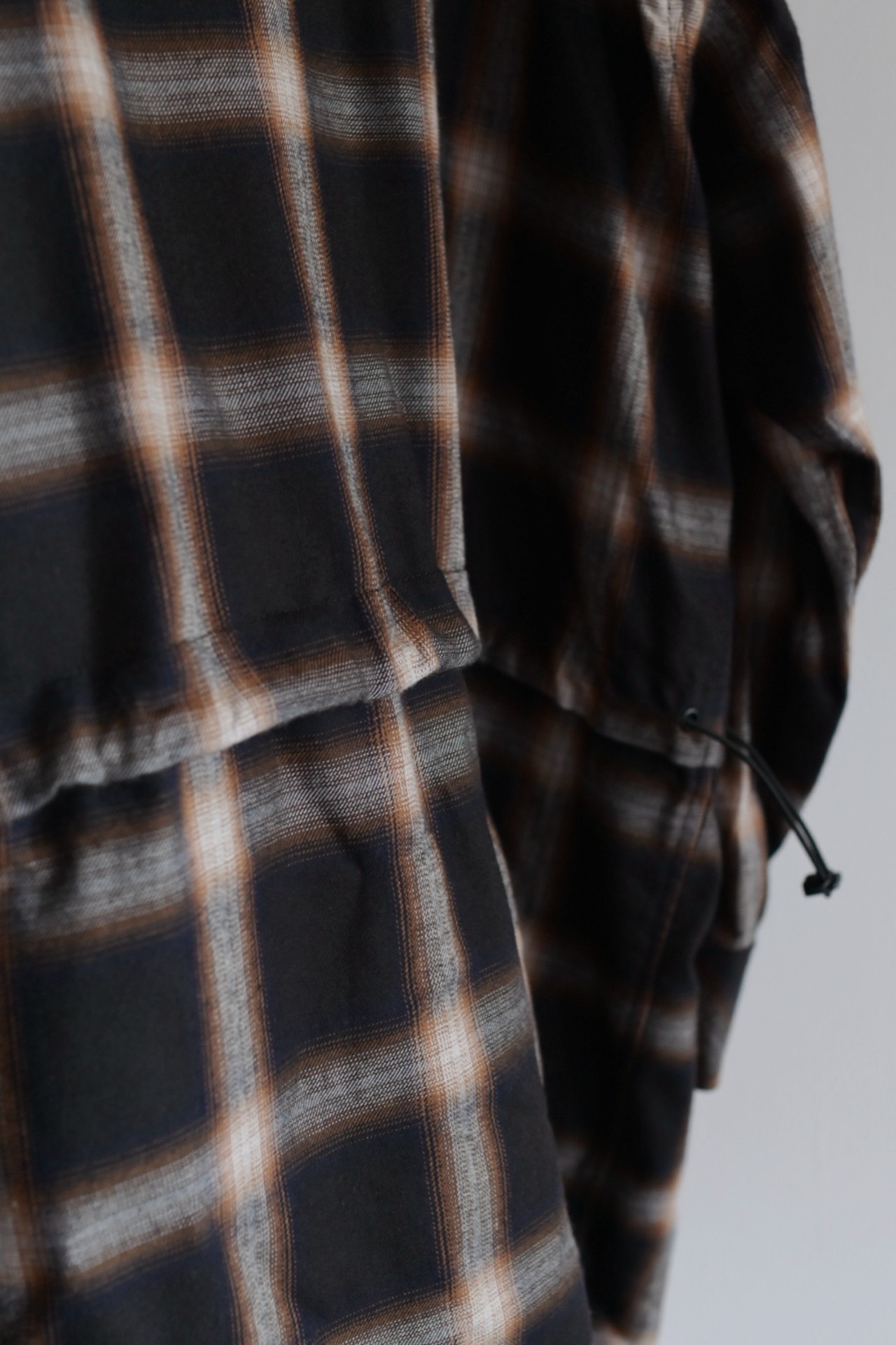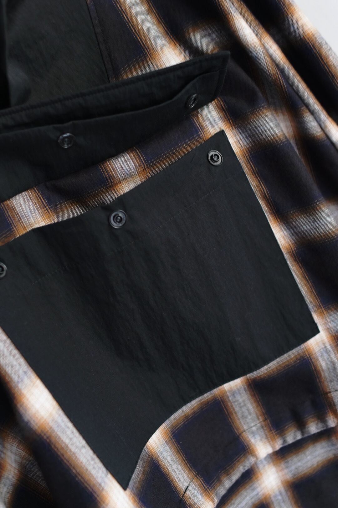 チェック柄が目を惹くアノラックシャツ。インナーでの着用時フードが雨を防げるように撥水素材を採用。
