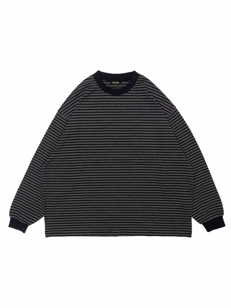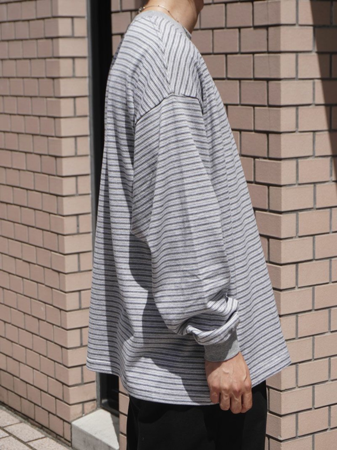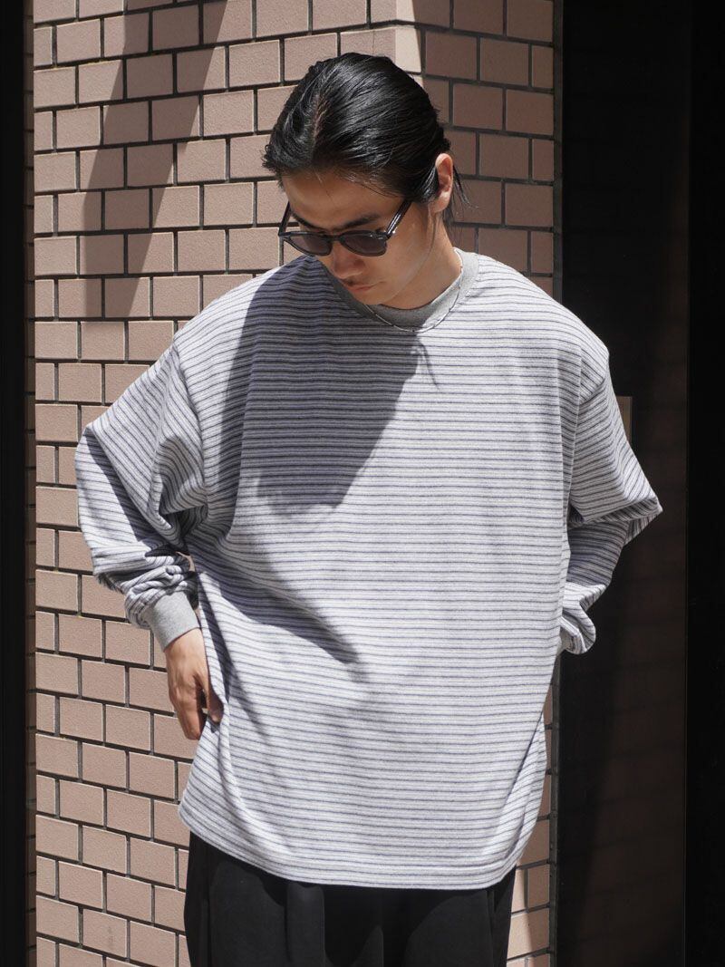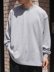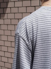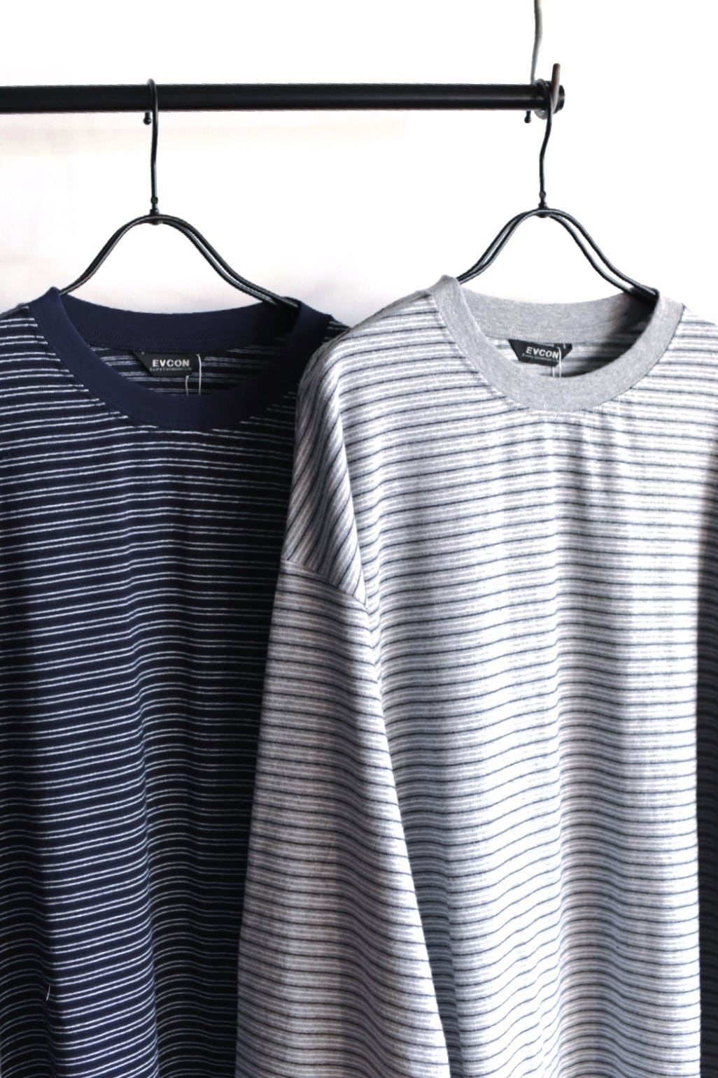 エビコン定番のミジンコボーダー。一見無地に見えるきめ細やかなボーダー。都会的な印象になり、マリンボーダーが苦手な人にもおすすめ。よくみると3色使いで、生地感もちょうどいい肉感。