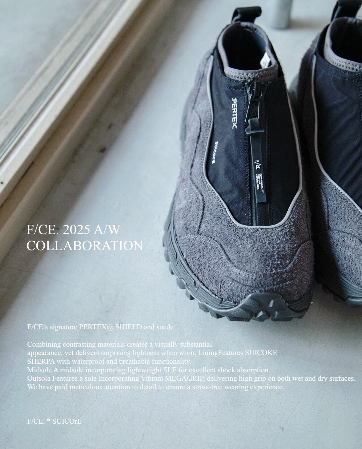 『AKK-ZIP』モデルをベースにF/CE別注仕様で構築。インナーレイヤーが快適なフィット感を提供する。ライニングは防水透湿機能を備えたSUICOKE SHERPA仕様。