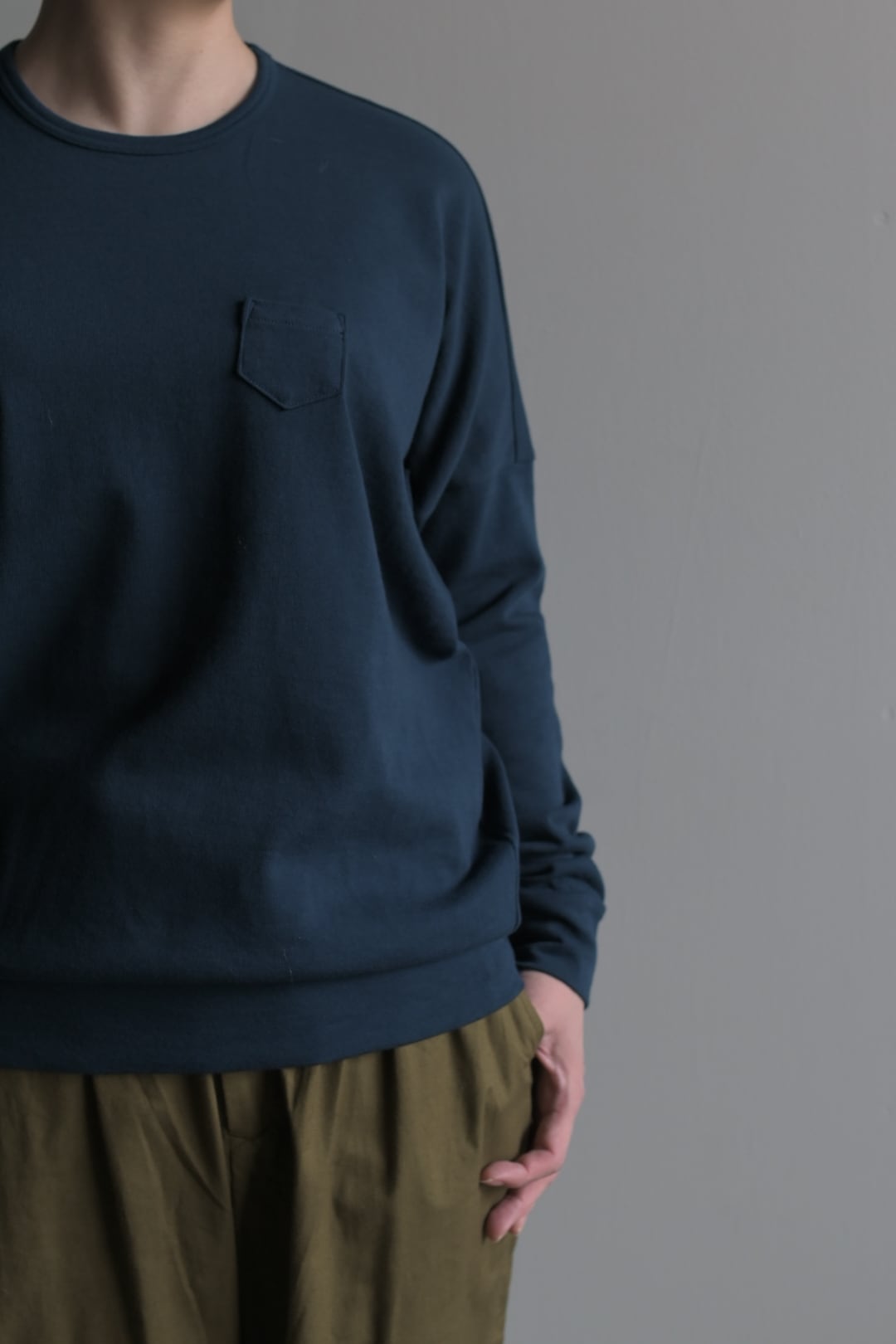 1枚でメインで着たいときに、あんまりフィット感のある生地だと使いにくいけど、ちゃんと1枚でも安心感のあるゆとりがあります。それでいてインナーにしても上から何でも着れるすっきり感。コットン生地なので秋から春先まで長く活用できます。