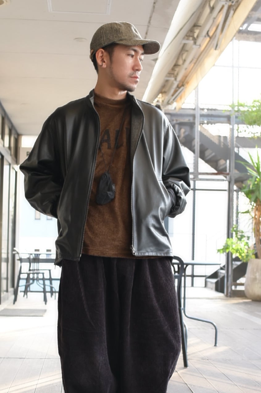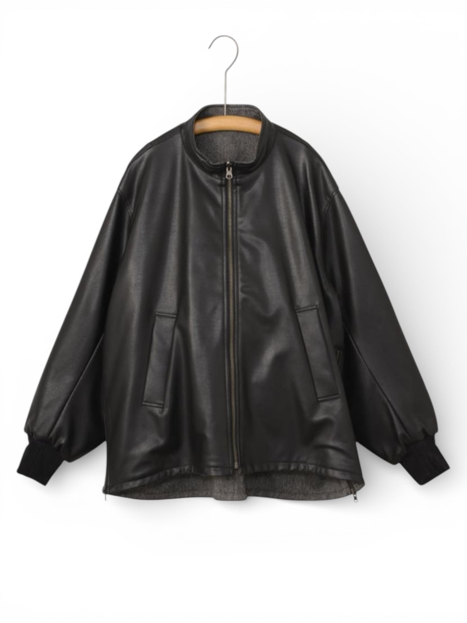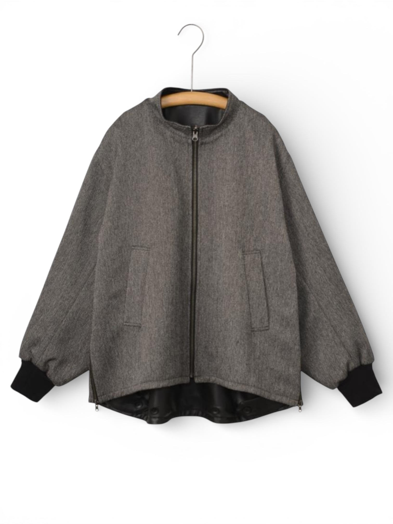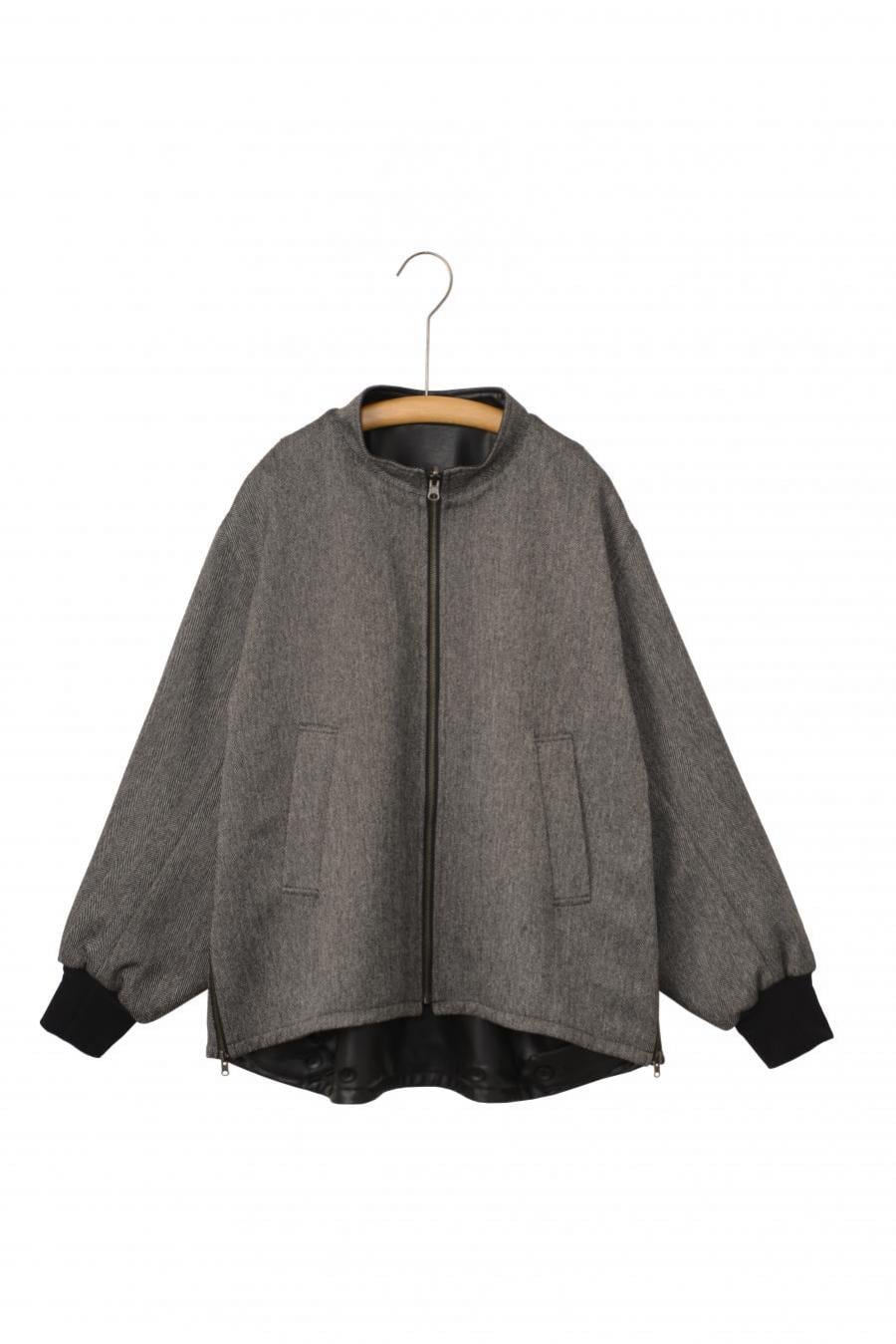 リバーシブルのスタンドカラーブルゾン。表面にリアルライクなエコレザーを使用。裏面にはトラッドでウールライクなポリエステルのヘリンボーンを使用し、ライダース感とトラッドを併せて表現しました。袖口は別生地リブ仕様。すっきりとしたスタンドカラーに、サイドのジップがポイントです。後裾のタブでフォルムの変化も楽しんで頂けます。