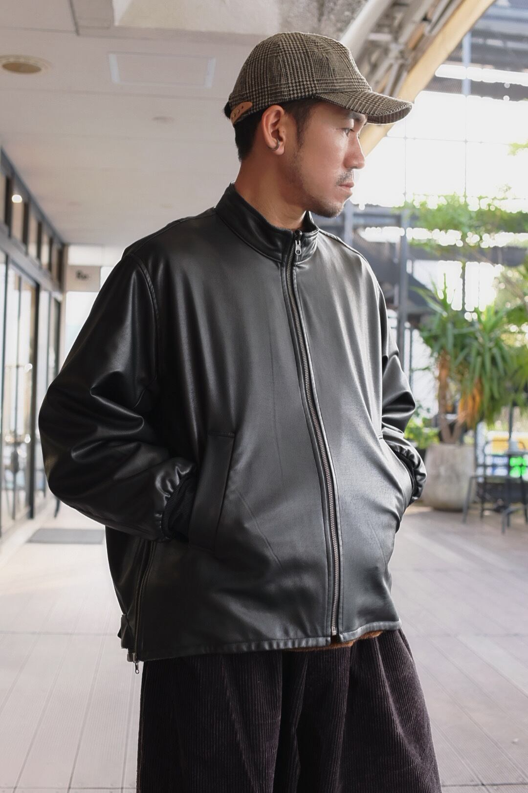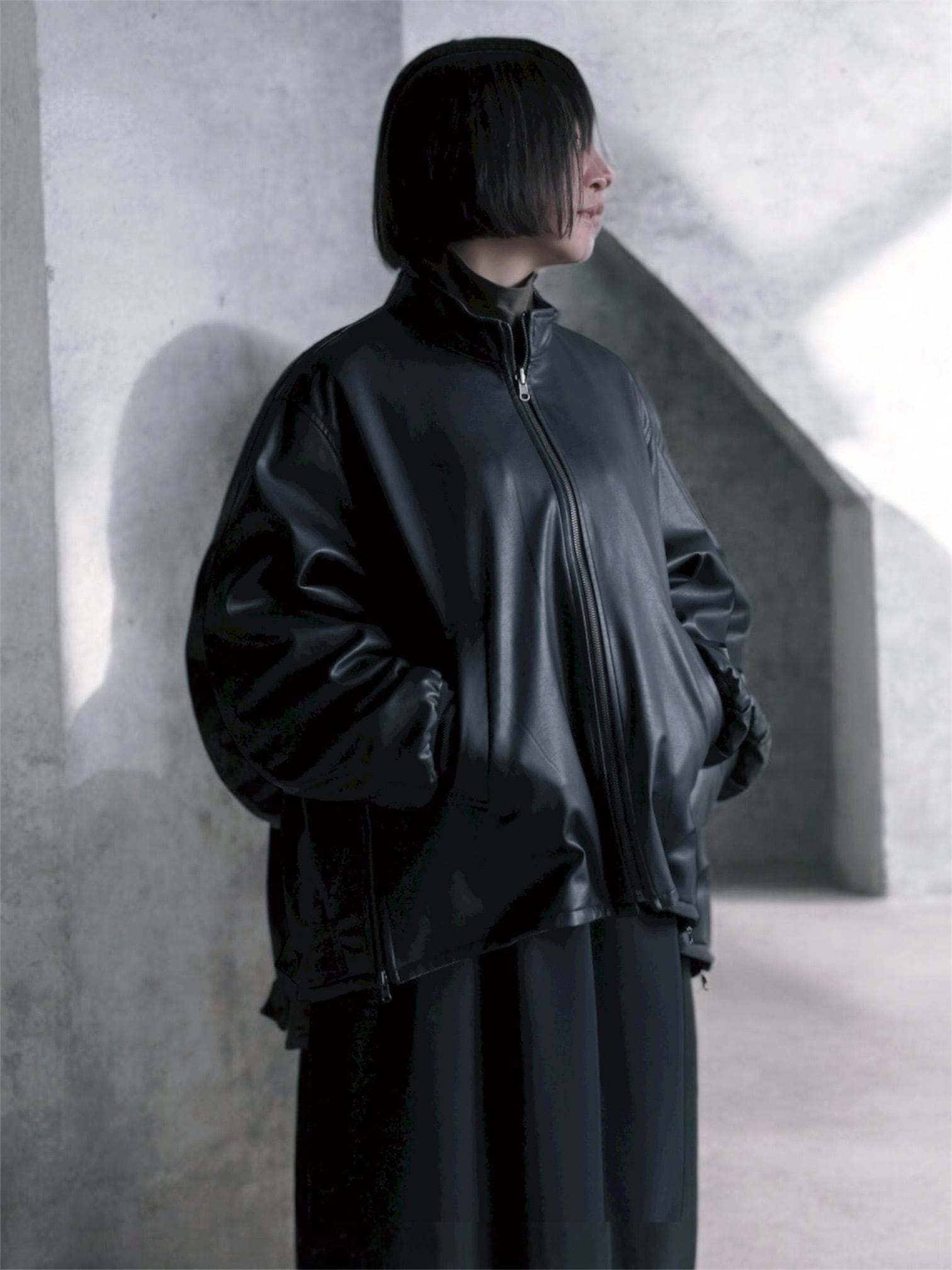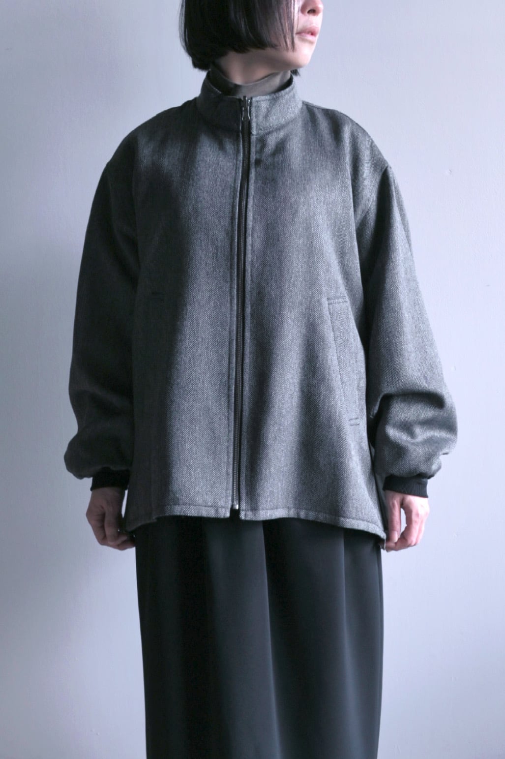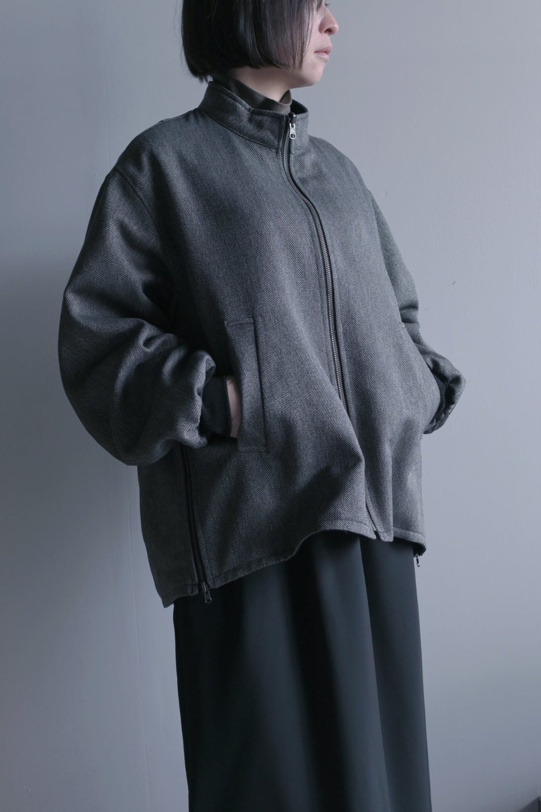 リバーシブルのスタンドカラーブルゾン。表面にリアルライクなエコレザーを使用。裏面にはトラッドでウールライクなポリエステルのヘリンボーンを使用し、ライダース感とトラッドを併せて表現しました。袖口は別生地リブ仕様。すっきりとしたスタンドカラーに、サイドのジップがポイントです。後裾のタブでフォルムの変化も楽しんで頂けます。