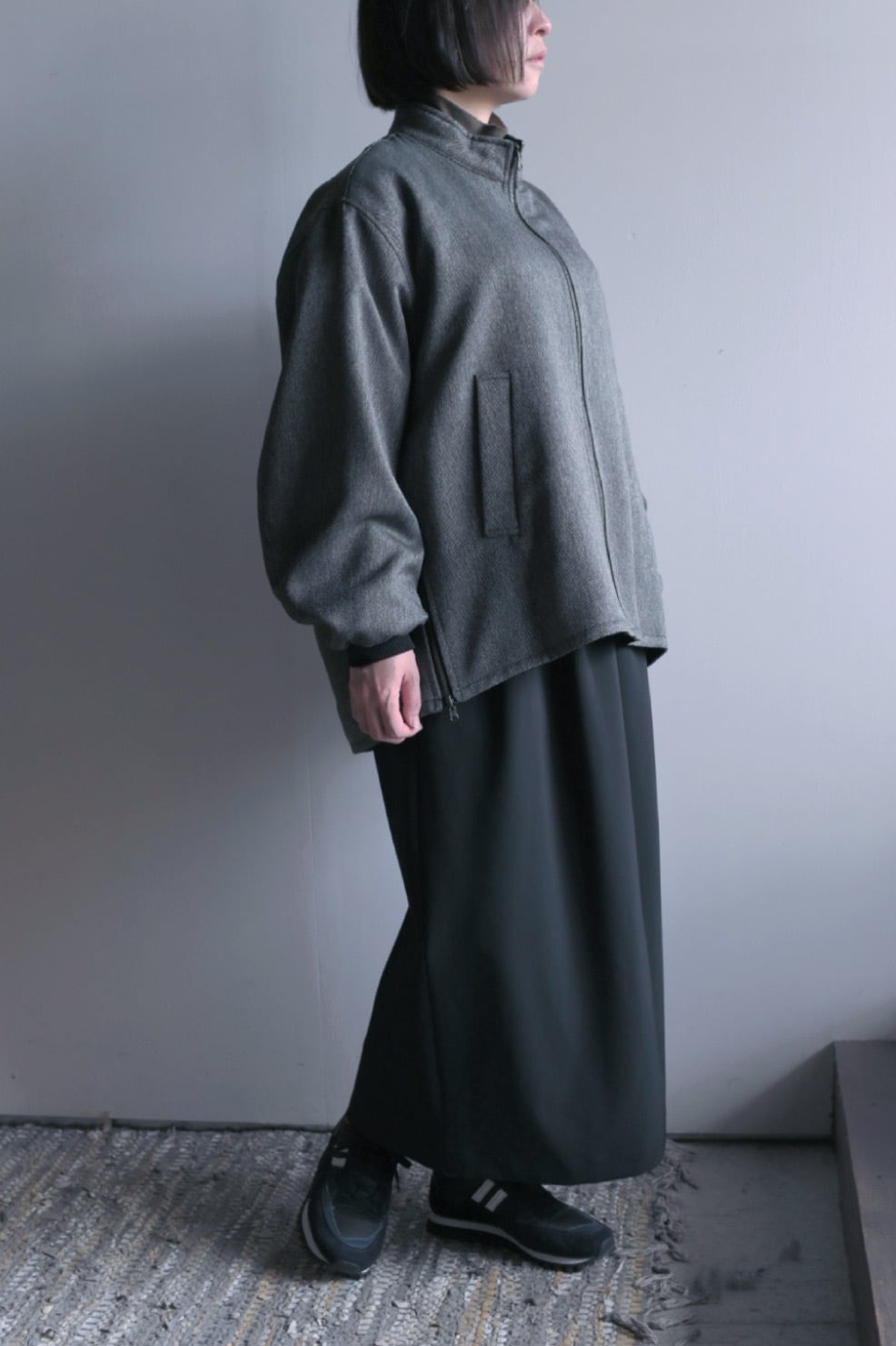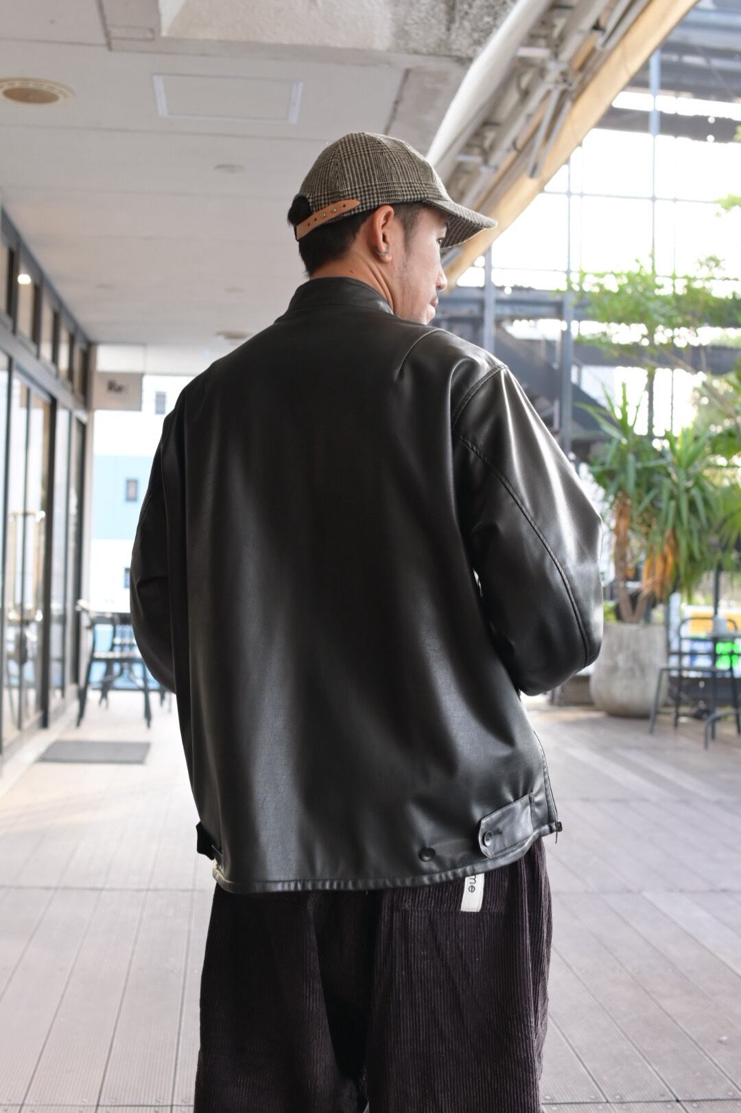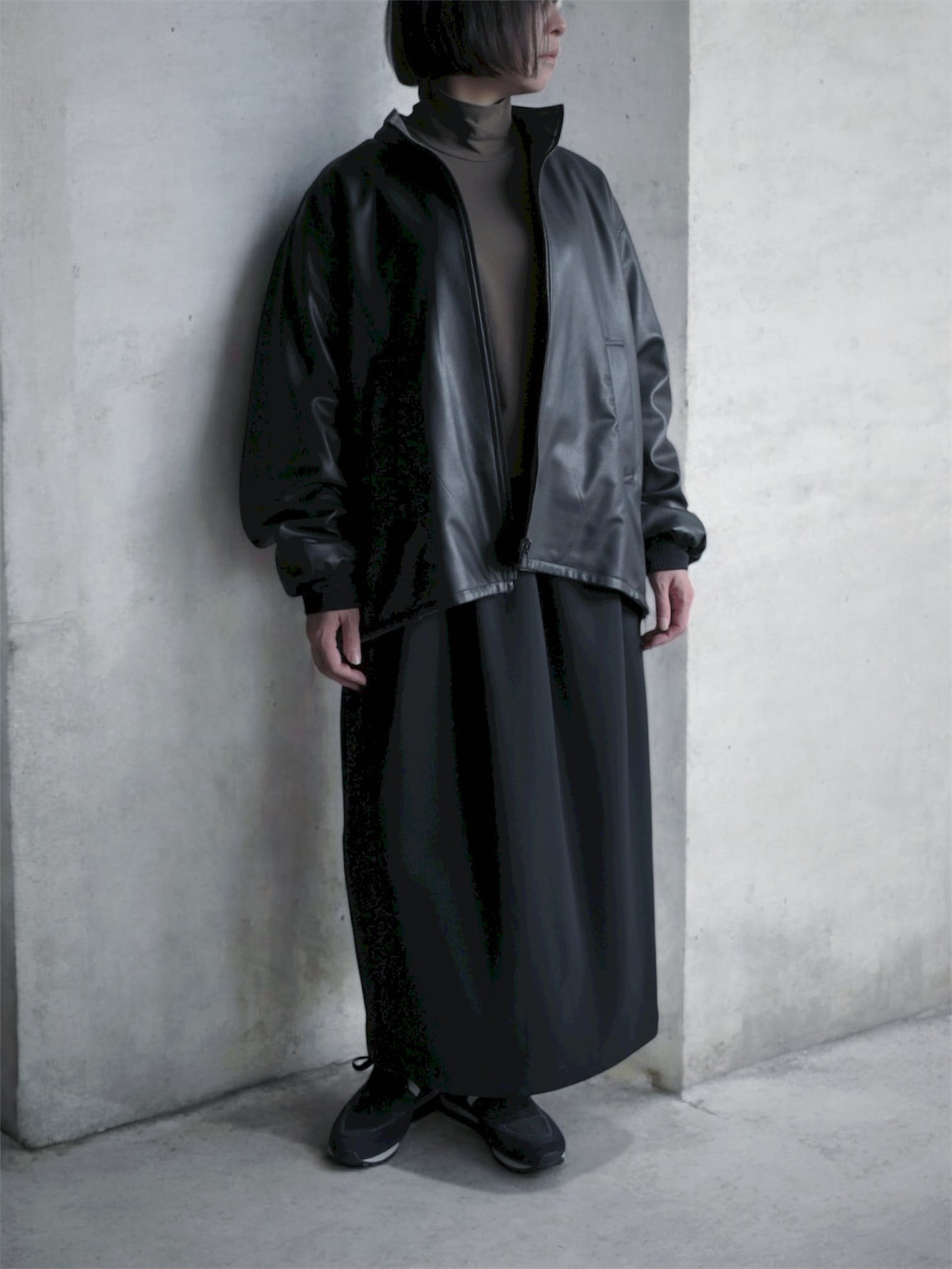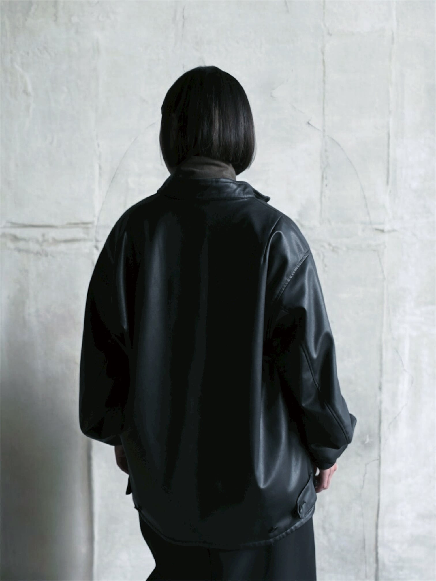 リバーシブルのスタンドカラーブルゾン。表面にリアルライクなエコレザーを使用。裏面にはトラッドでウールライクなポリエステルのヘリンボーンを使用し、ライダース感とトラッドを併せて表現しました。袖口は別生地リブ仕様。すっきりとしたスタンドカラーに、サイドのジップがポイントです。後裾のタブでフォルムの変化も楽しんで頂けます。