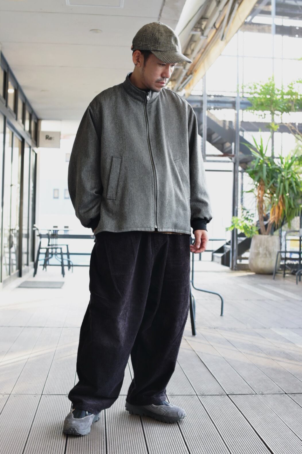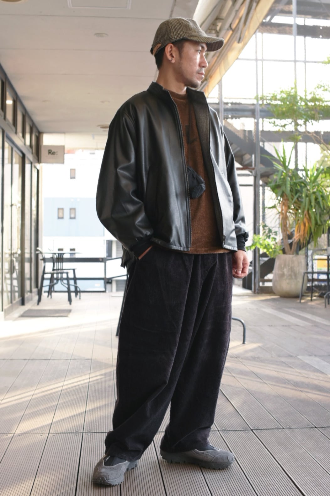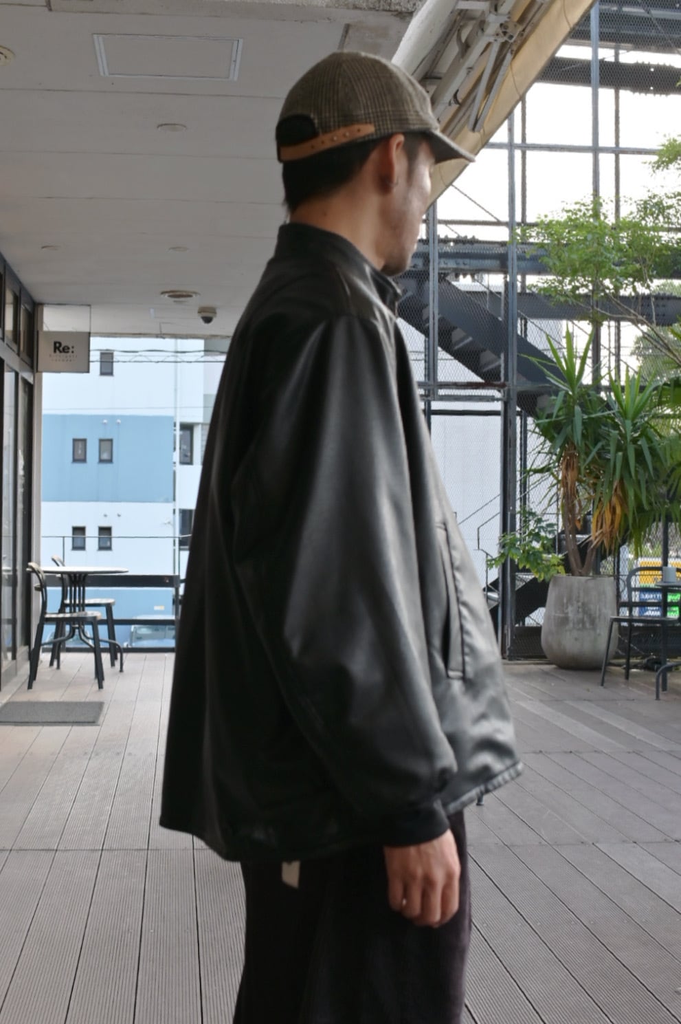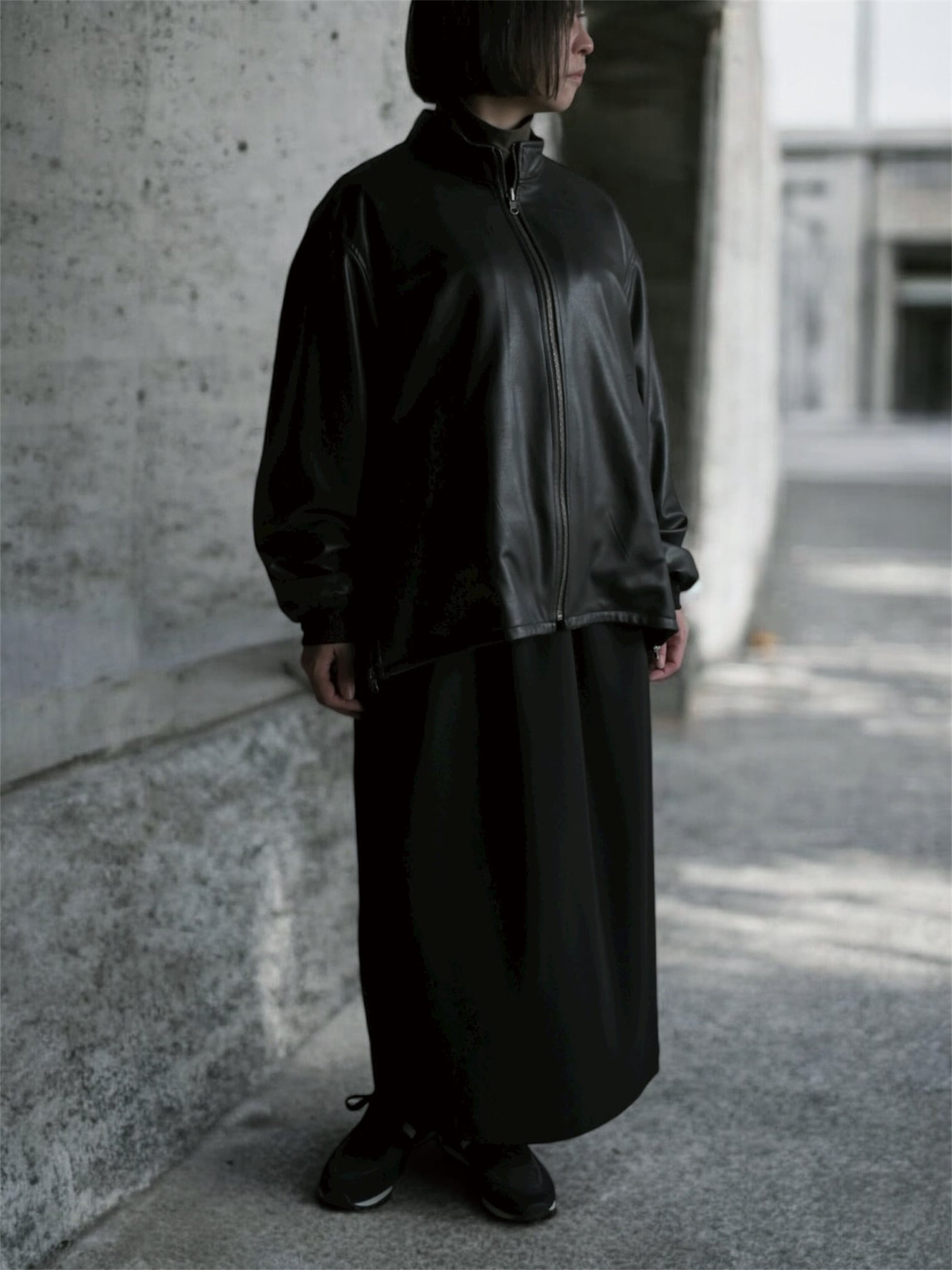 リバーシブルのスタンドカラーブルゾン。表面にリアルライクなエコレザーを使用。裏面にはトラッドでウールライクなポリエステルのヘリンボーンを使用し、ライダース感とトラッドを併せて表現しました。袖口は別生地リブ仕様。すっきりとしたスタンドカラーに、サイドのジップがポイントです。後裾のタブでフォルムの変化も楽しんで頂けます。