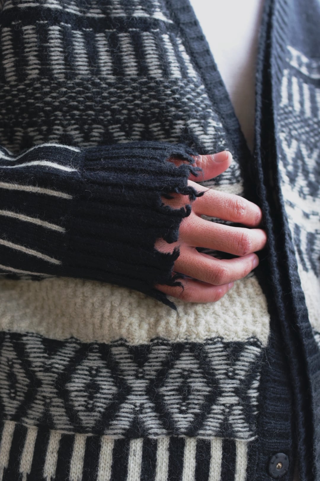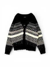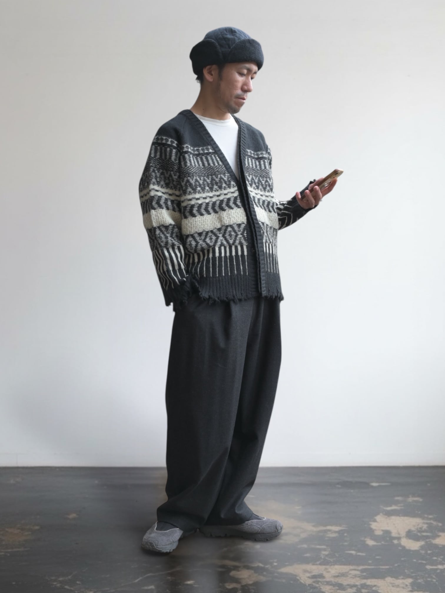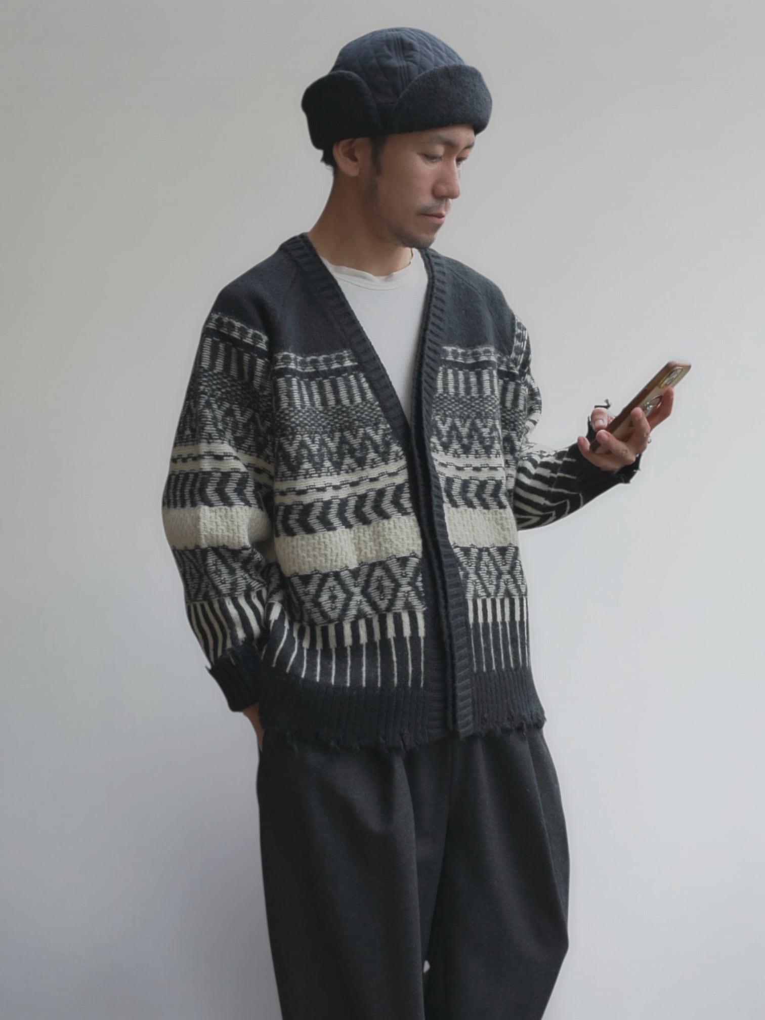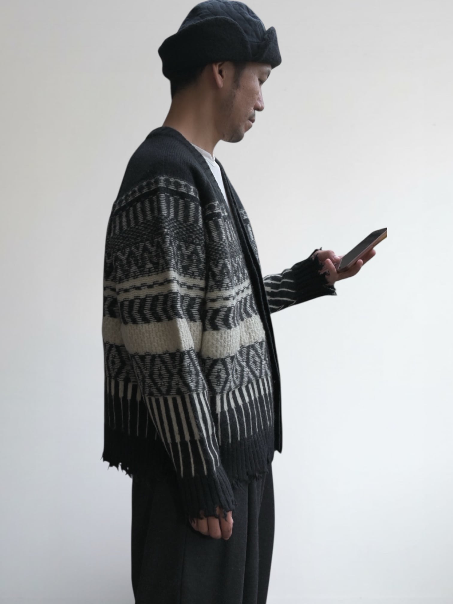 ジャガードニットのカーディガン。ふわっとした柔らかいモヘア混の糸をベースに、ラムウールナイロンのヴィンテージ風な粗野感のある糸でアイボリーの配色を施したジャガード編みのニットです。柄の裏編みと表編みを組み合わせて甘くないテイストに仕上げています。袖口とヘムにほつれたようなダメージ加工を施し、よりヴィンテージ感を演出しています。二重の襟もアクセントになっています。フロントには金属のスナップ釦を使用し、シンプルに仕上げました。