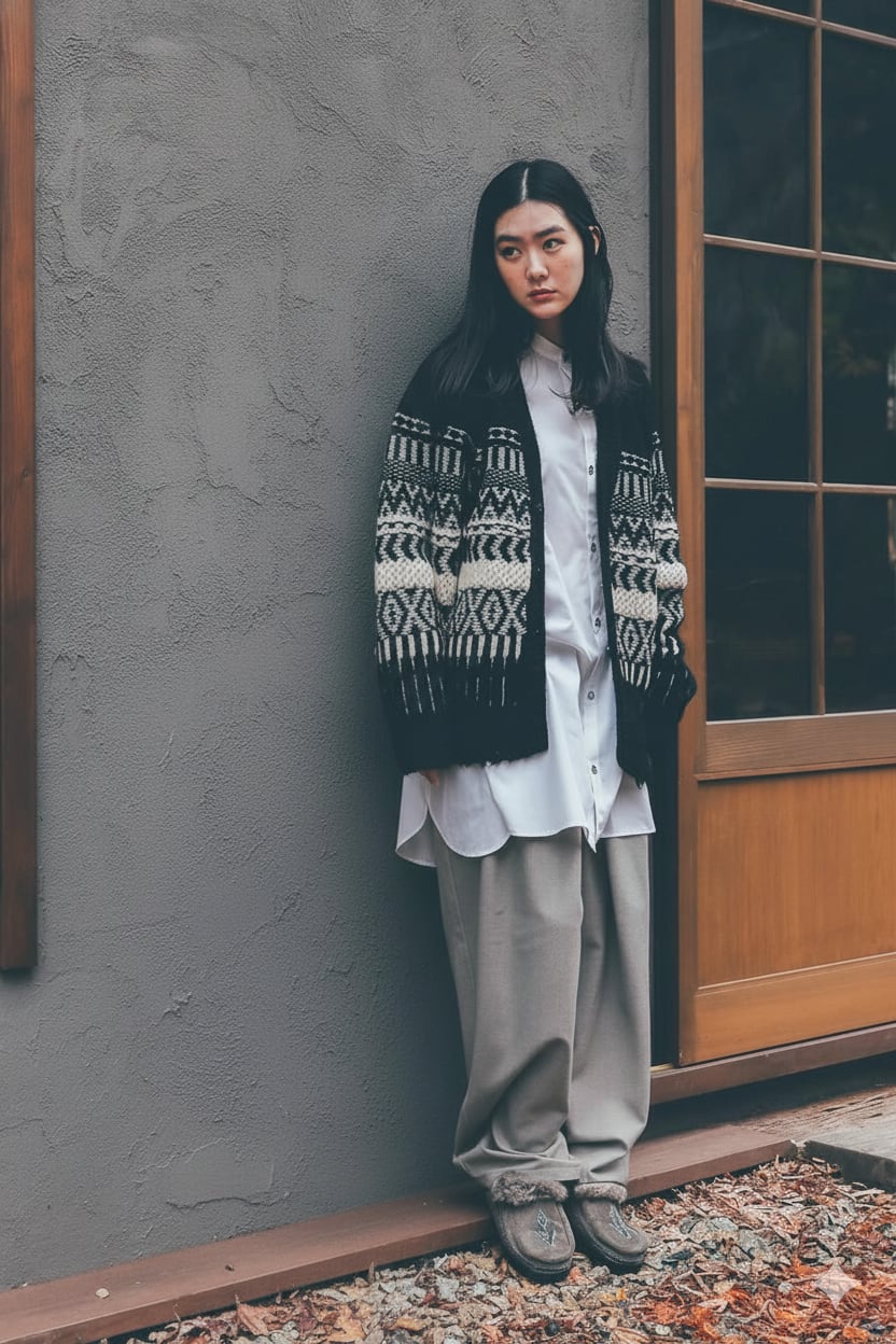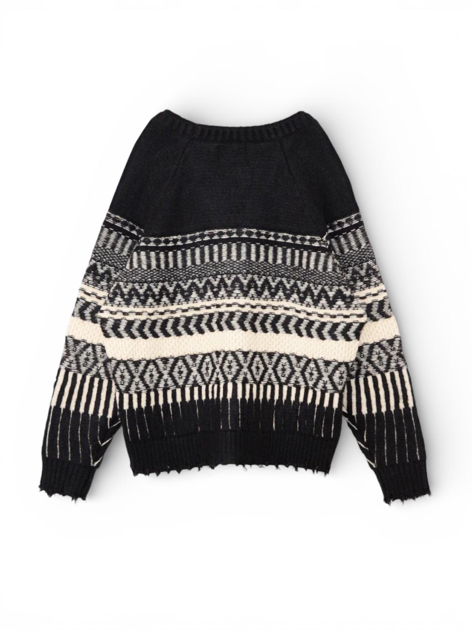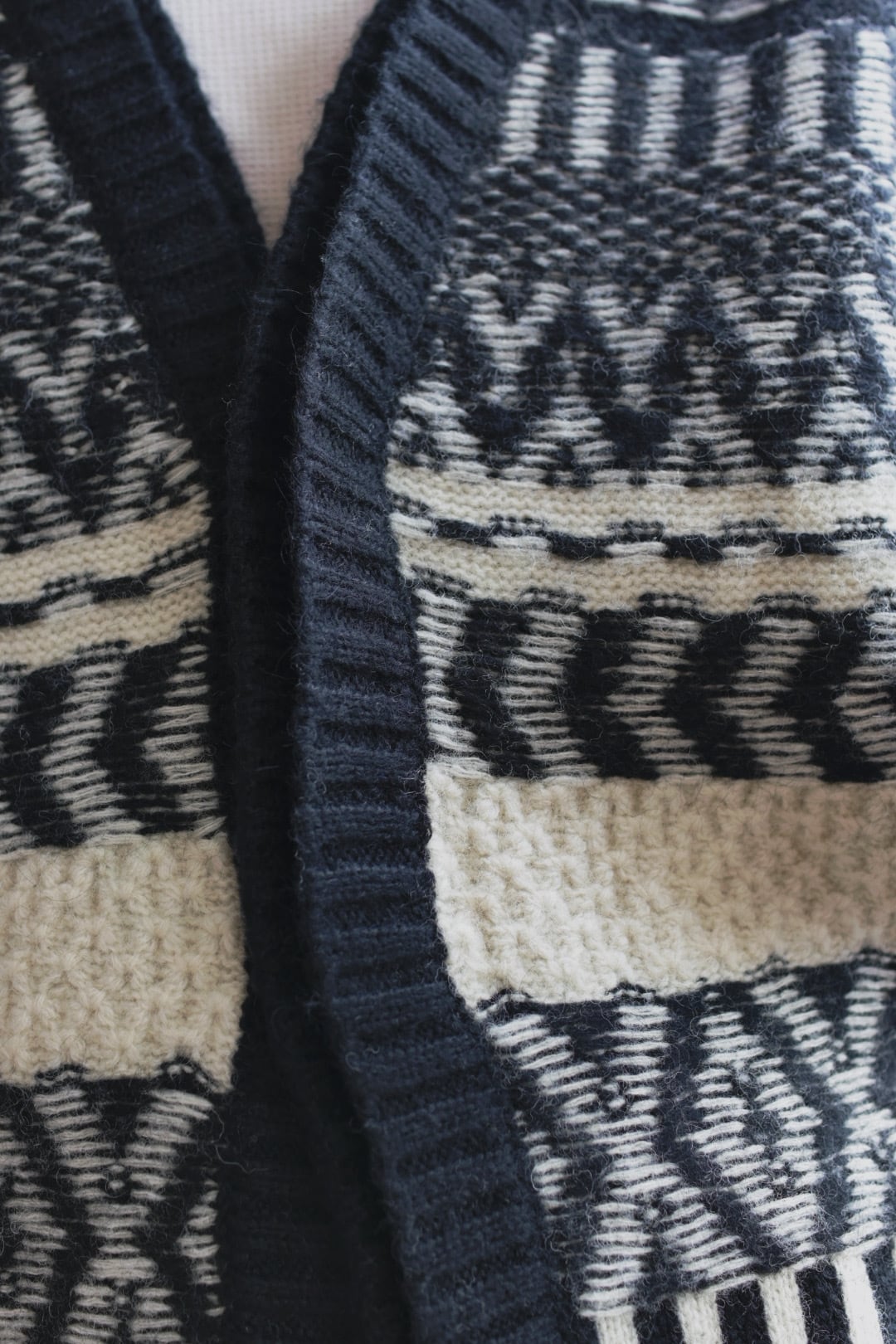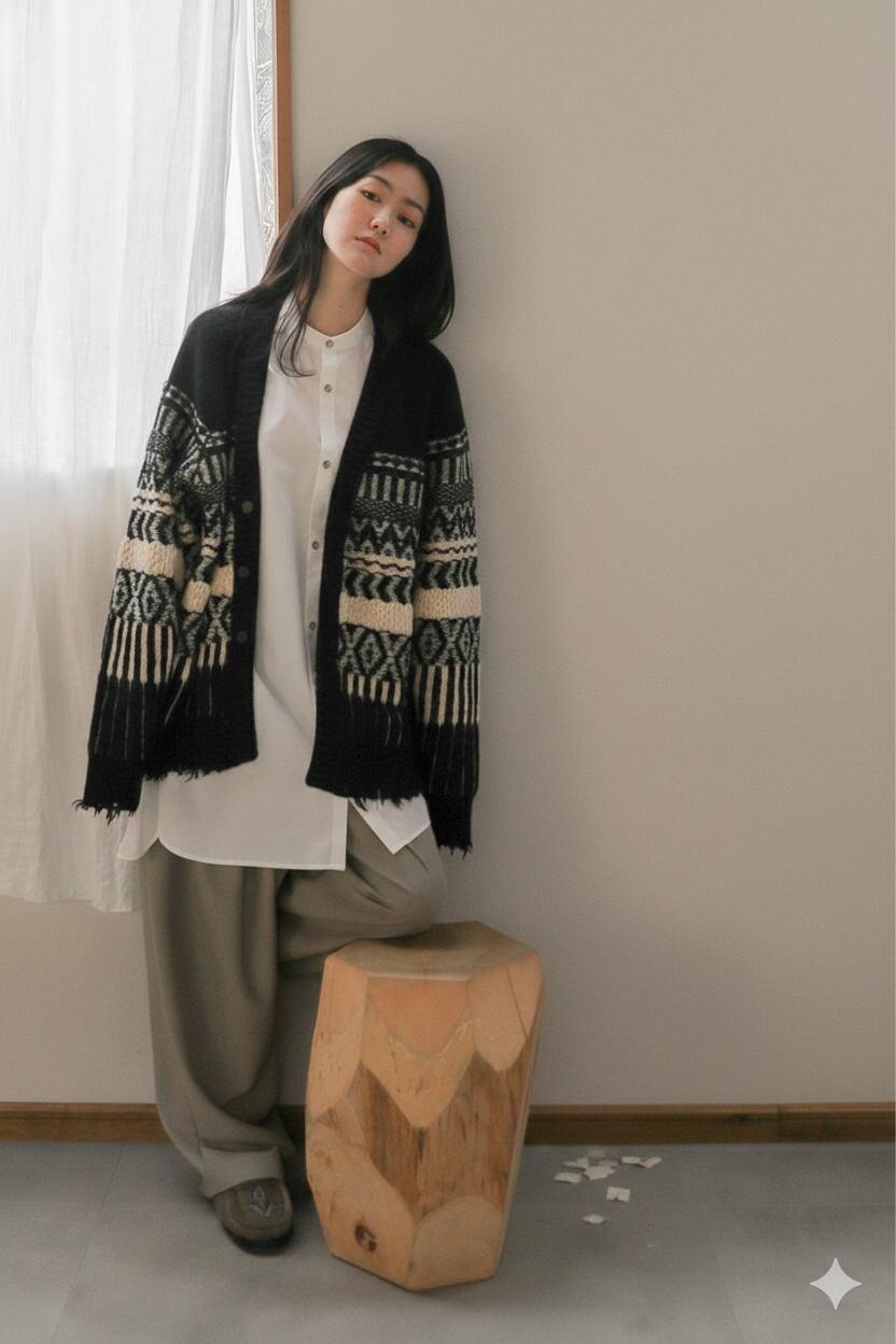 ジャガードニットのカーディガン。ふわっとした柔らかいモヘア混の糸をベースに、ラムウールナイロンのヴィンテージ風な粗野感のある糸でアイボリーの配色を施したジャガード編みのニットです。柄の裏編みと表編みを組み合わせて甘くないテイストに仕上げています。袖口とヘムにほつれたようなダメージ加工を施し、よりヴィンテージ感を演出しています。二重の襟もアクセントになっています。フロントには金属のスナップ釦を使用し、シンプルに仕上げました。