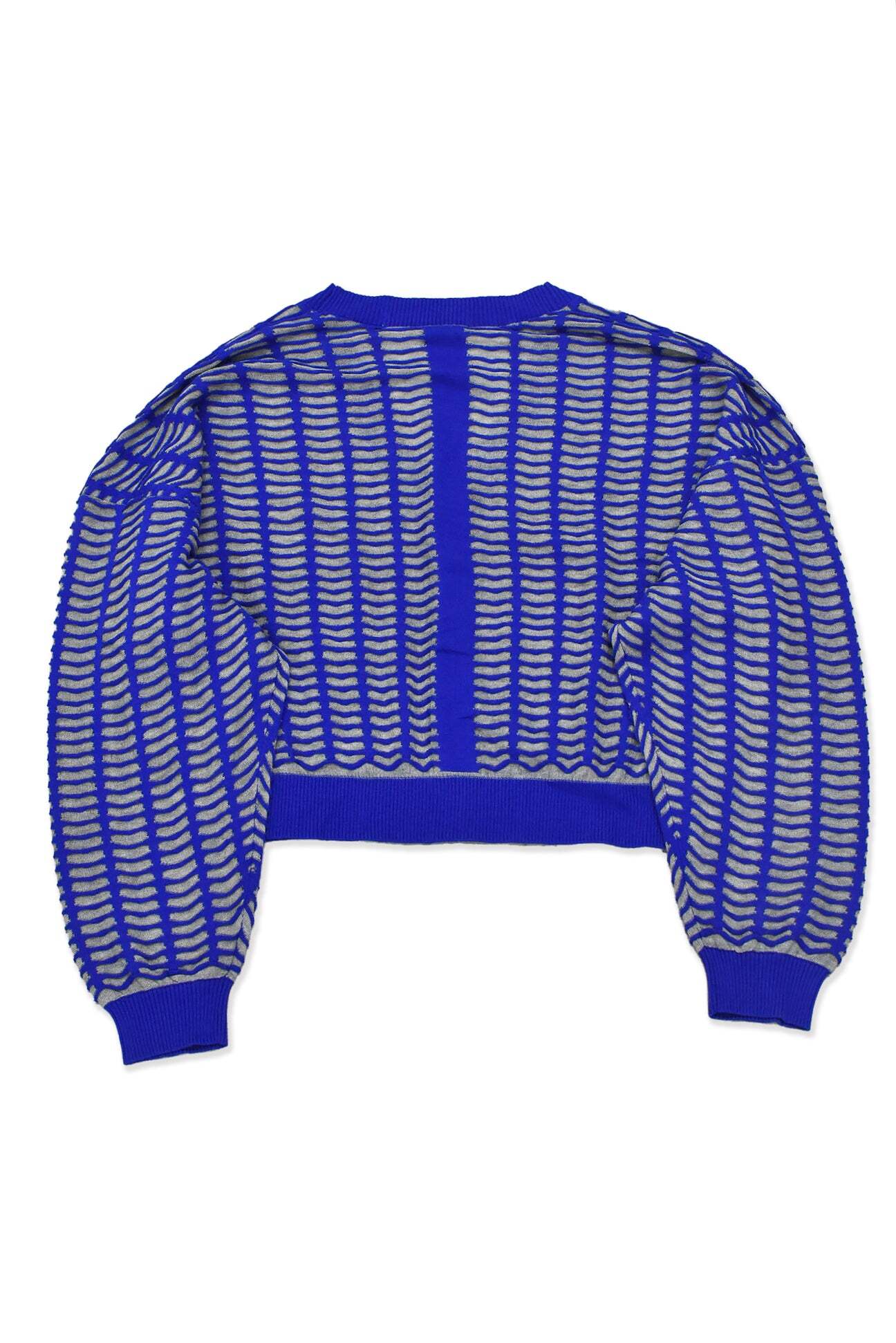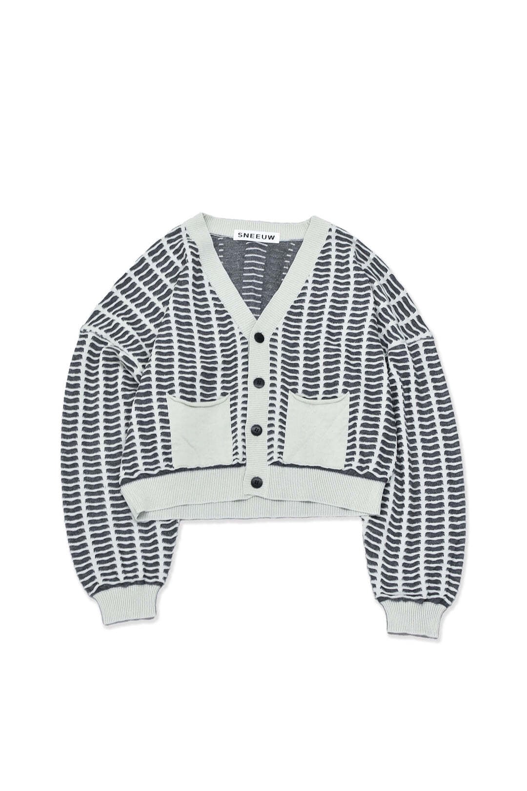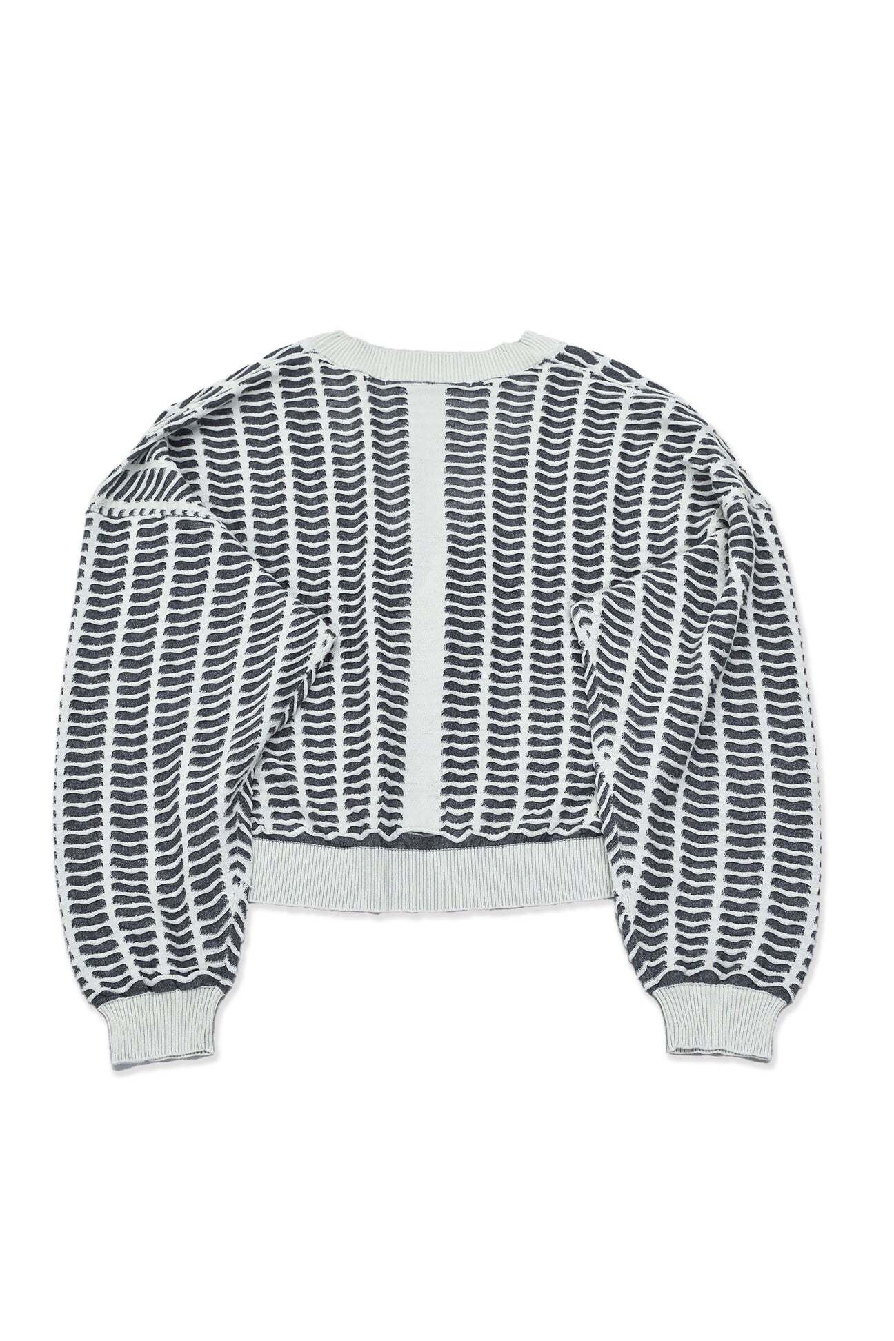 すりガラスの入った小さな窓が並んだような編地のカーディガン。
