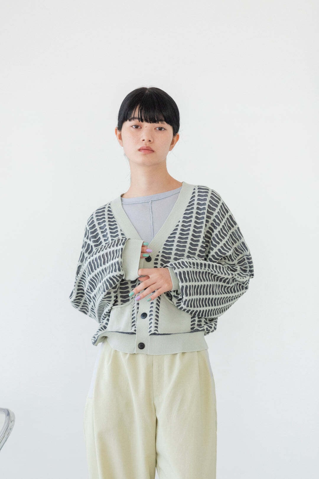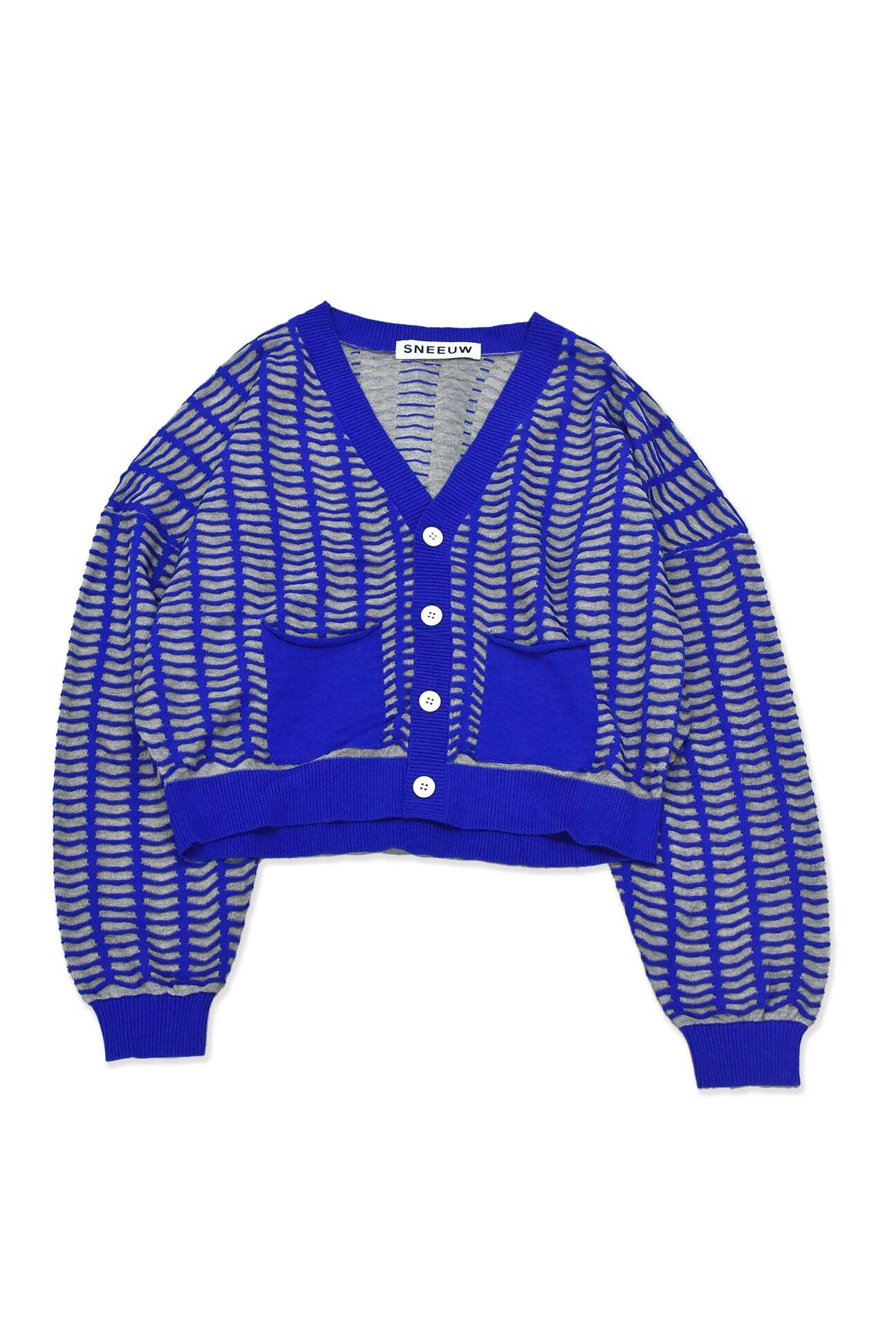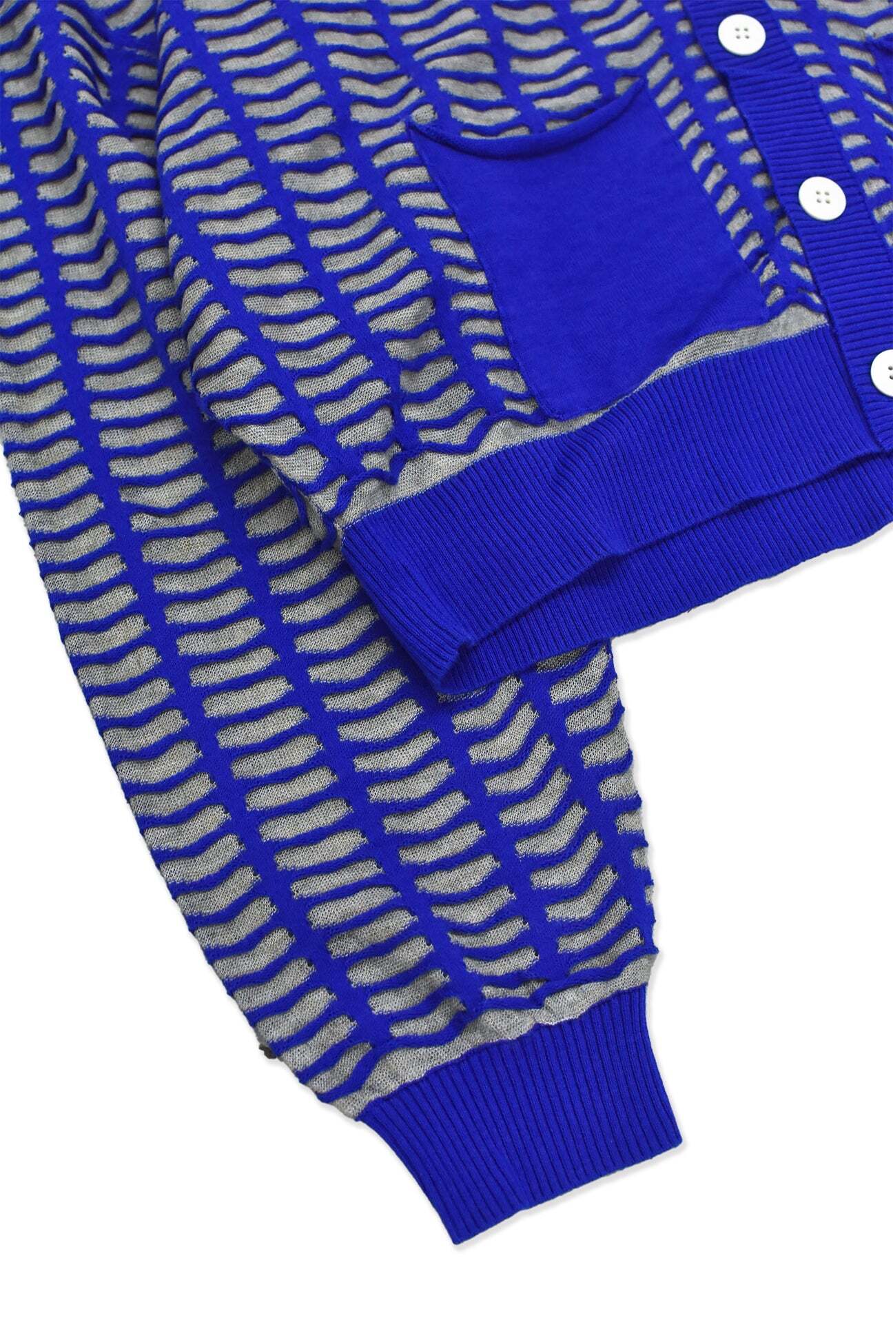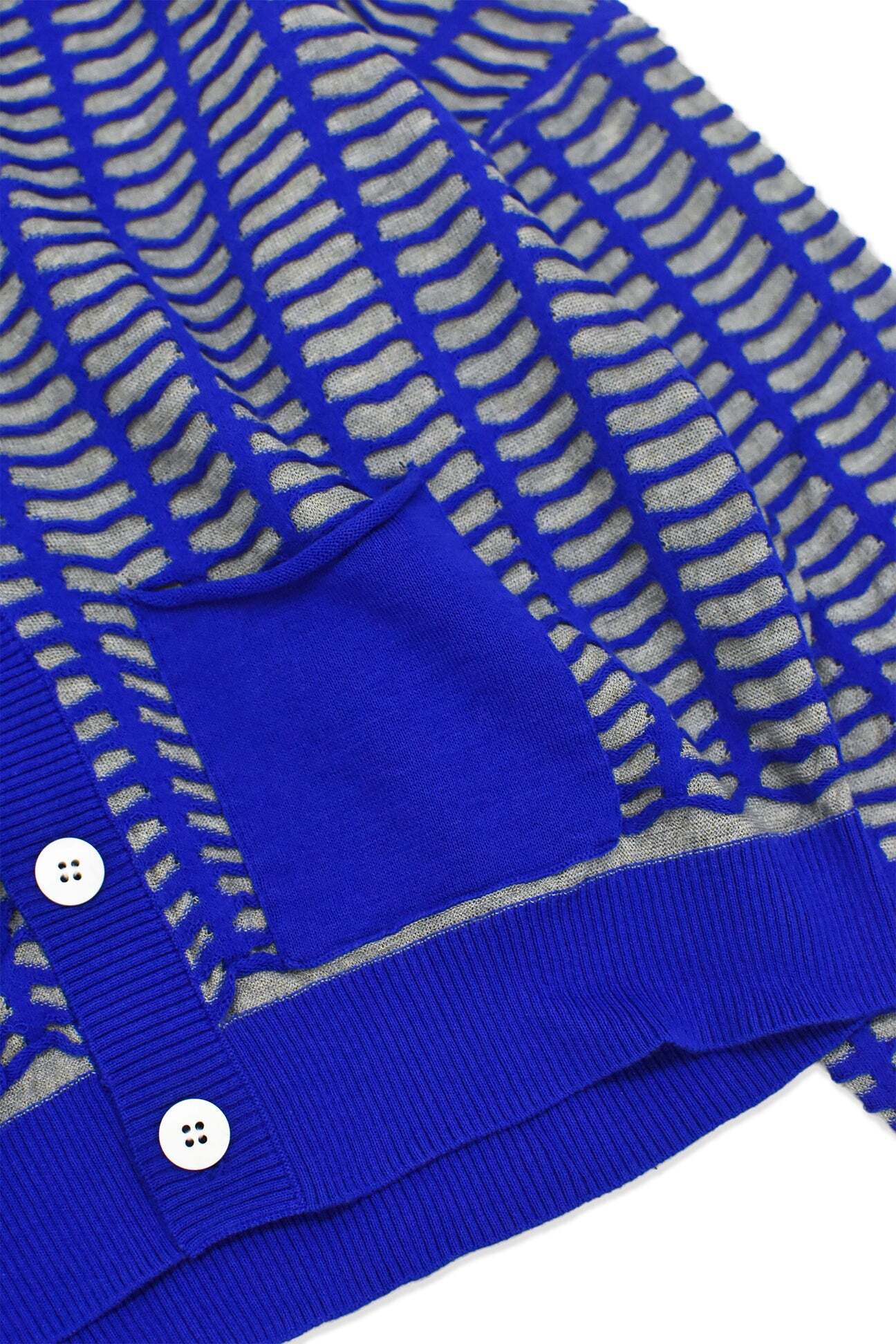 すりガラスの入った小さな窓が並んだような編地のカーディガン。