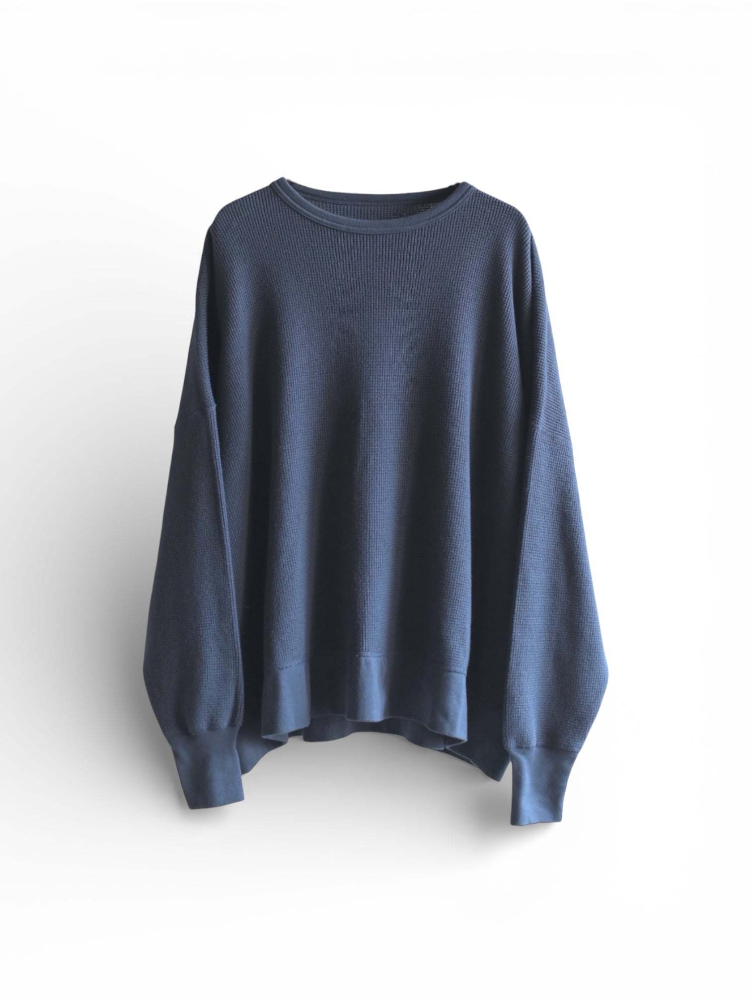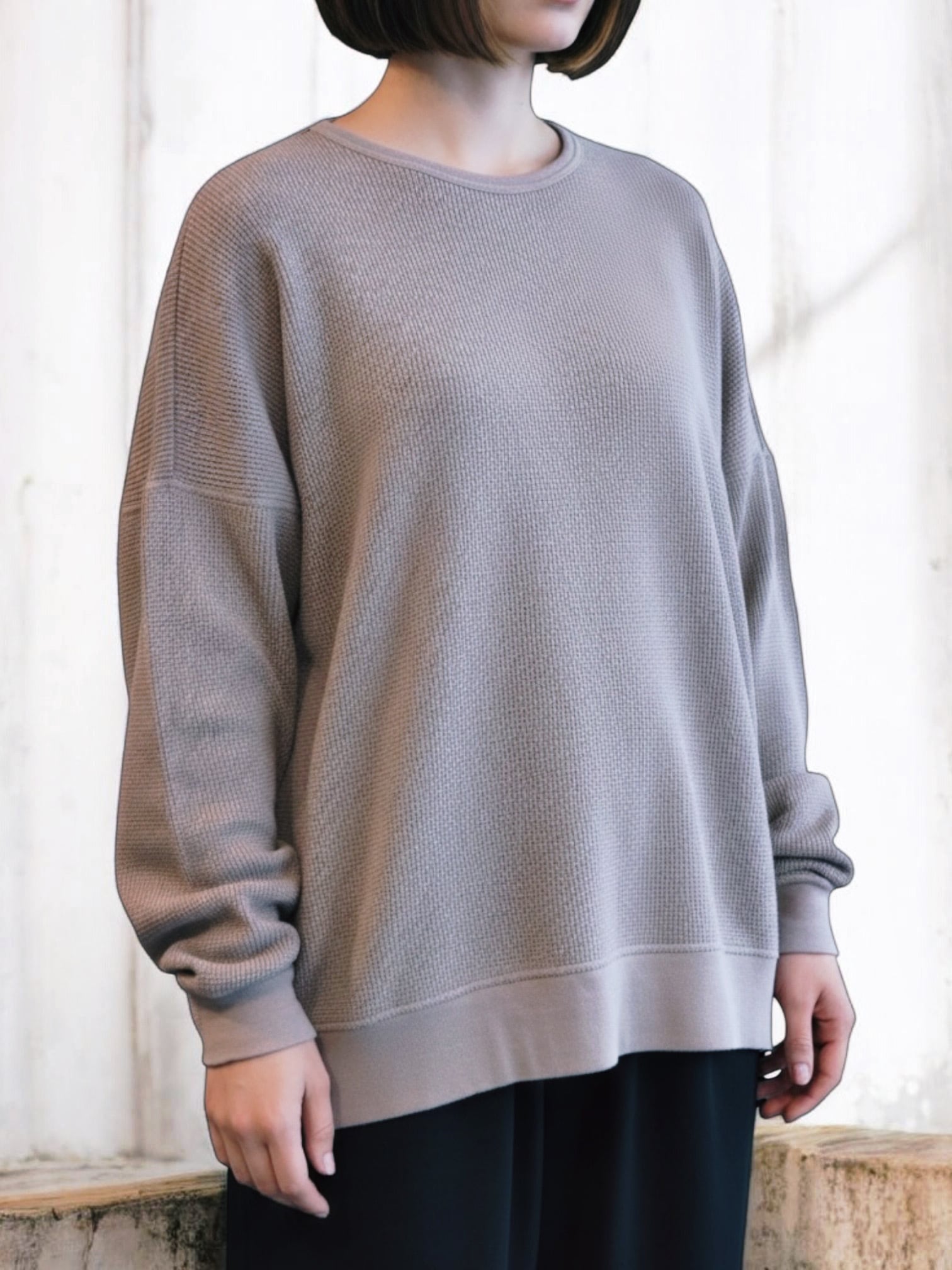 袖口には程よくフィットするリブを施し、ワイドな身頃とのコントラストをつくることで全体のバランスを引き締めています。デニムやワイドパンツ、スカートなど様々なボトムスと合わせやすく、日常のコーディネートに自然と馴染む一着。