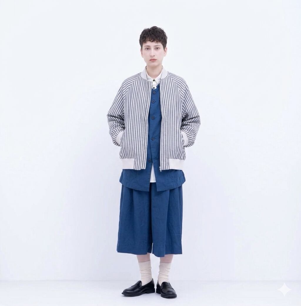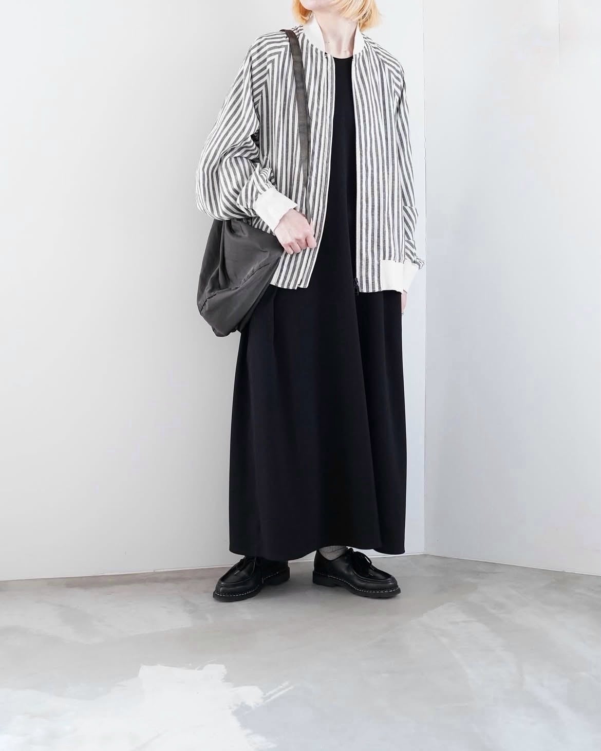 整いすぎていないストライプとキナリ×ブラックの配色が、無骨さを抑えつつ、都会的でフラットな印象に。ミリタリーらしさをほんのり残しながら、日常にすっと馴染みます。
