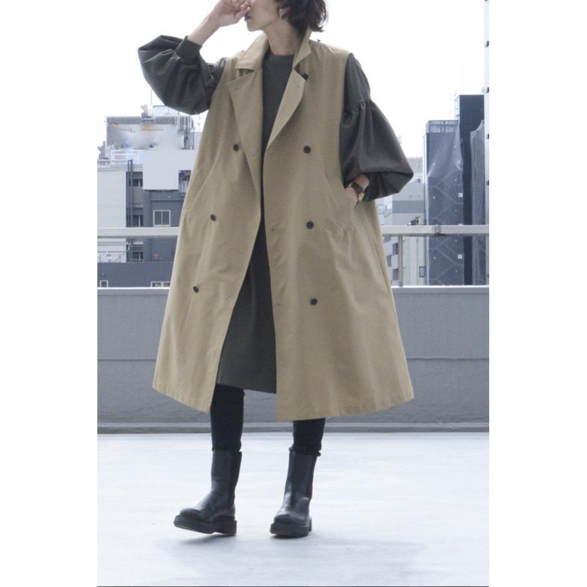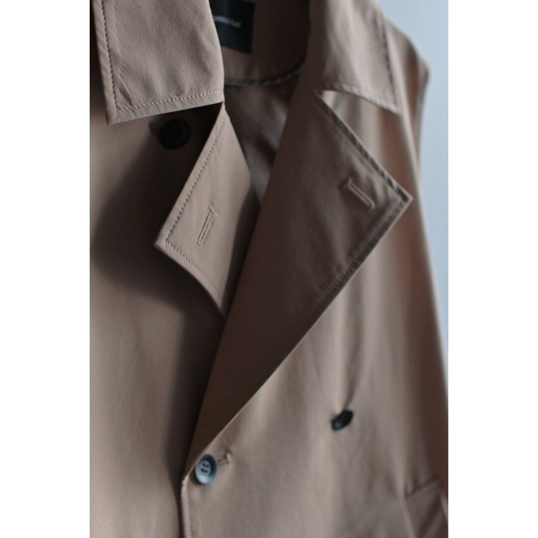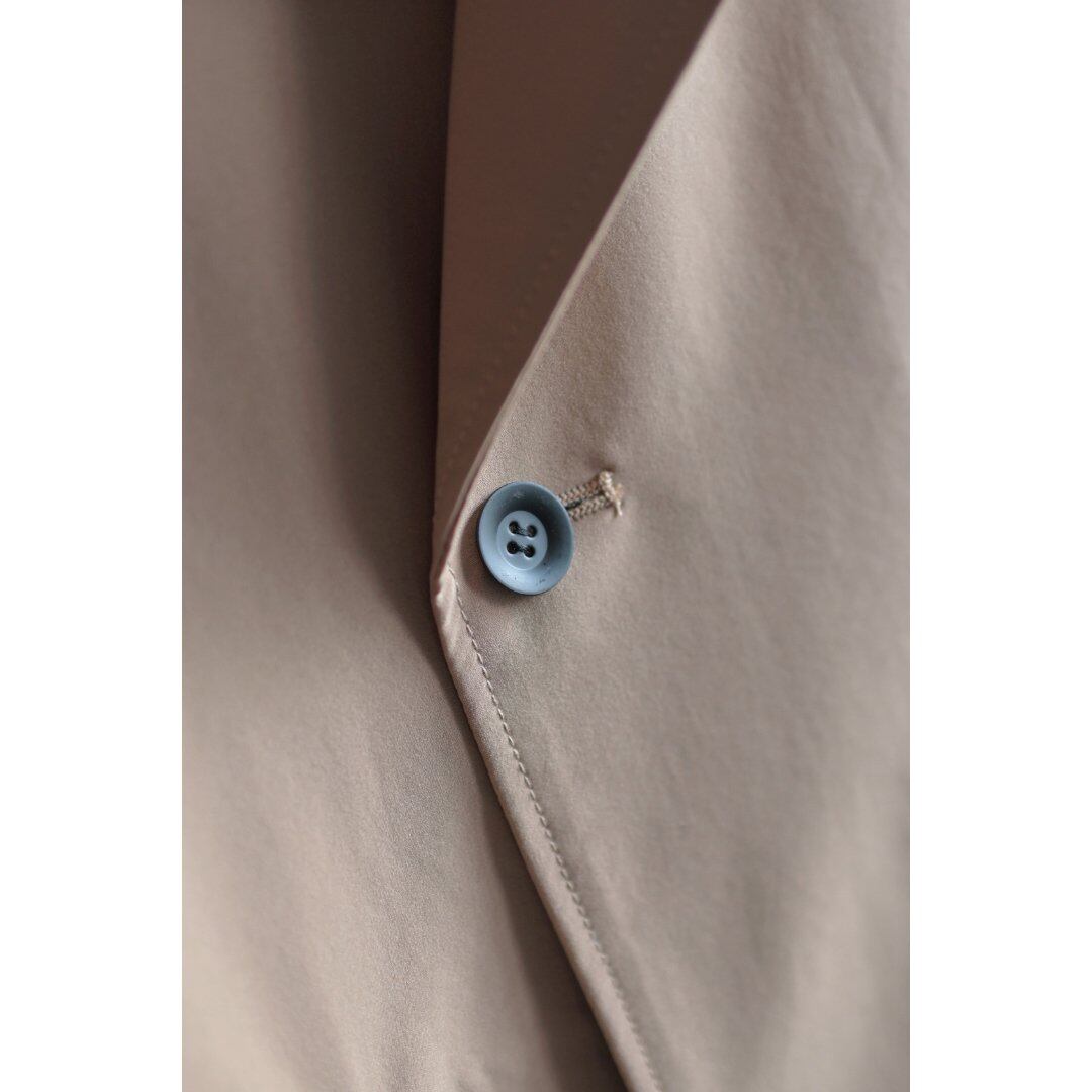 サスティナブルなECOPETの糸を使用したアクティブストレッチファブリック。撥水機能もあり、体の動きにフィットするしなやかな伸縮性とノーアイロンでお手入れ簡単なストレスフリーな素材をトレンチコートのようなディテールの軽いアウターに落とし込みました。ノーカラーのショートの羽織と、ベストに分かれる2wayコートでロングシーズン着用頂けるアイテムです。