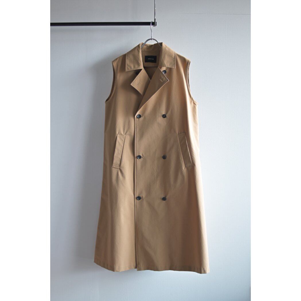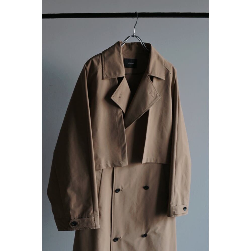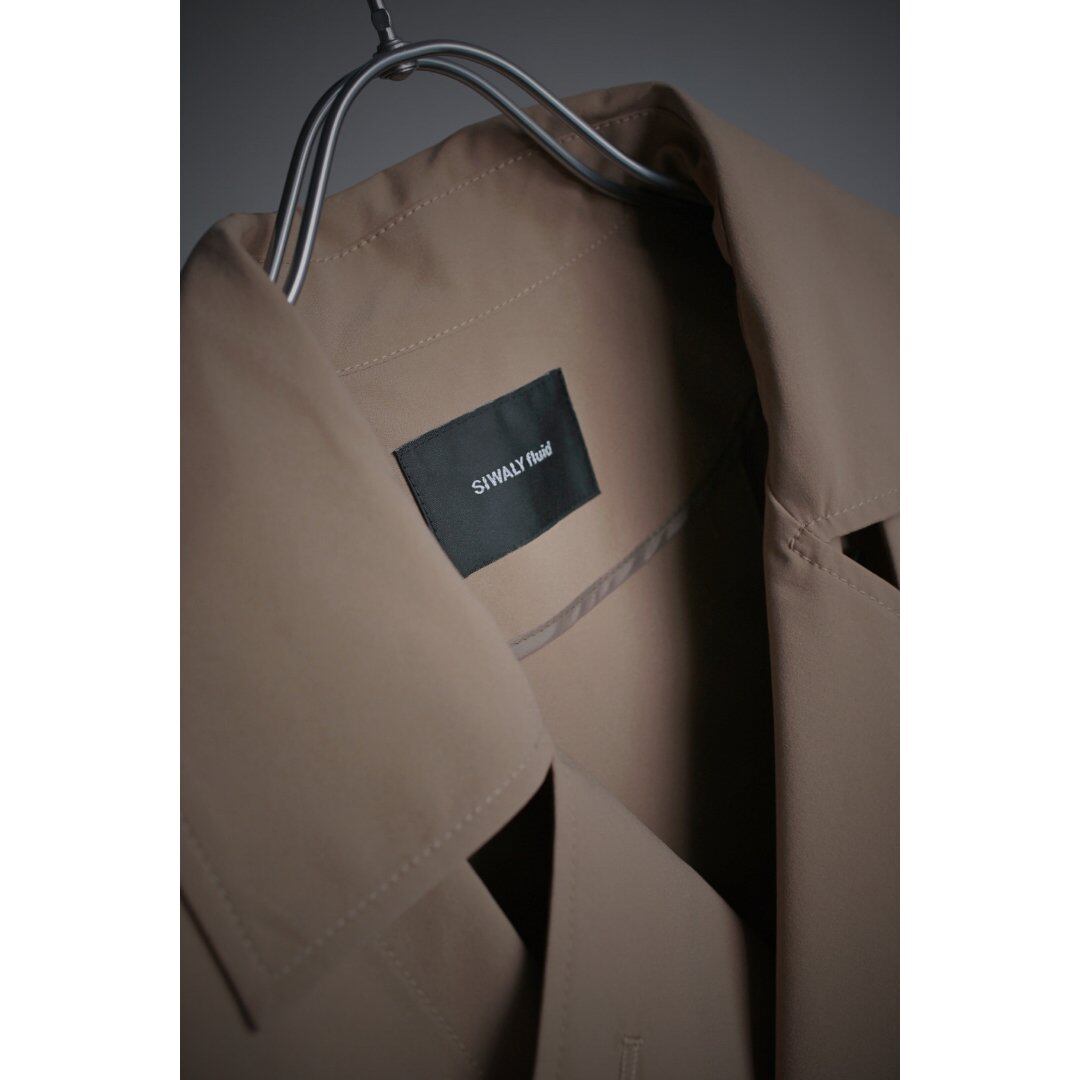 サスティナブルなECOPETの糸を使用したアクティブストレッチファブリック。撥水機能もあり、体の動きにフィットするしなやかな伸縮性とノーアイロンでお手入れ簡単なストレスフリーな素材をトレンチコートのようなディテールの軽いアウターに落とし込みました。ノーカラーのショートの羽織と、ベストに分かれる2wayコートでロングシーズン着用頂けるアイテムです。