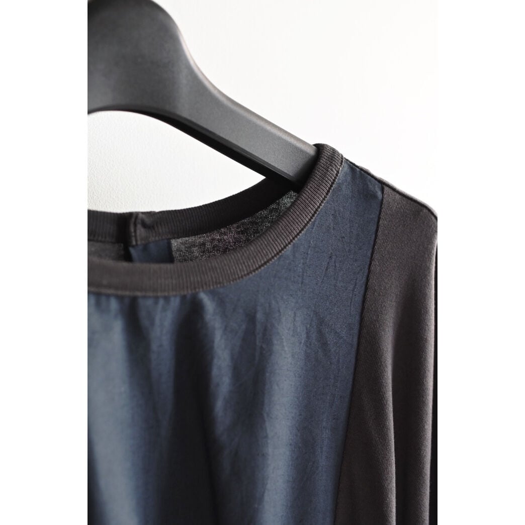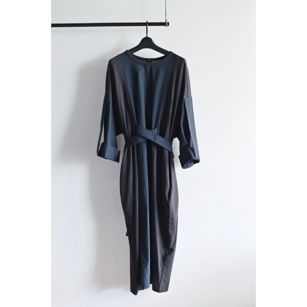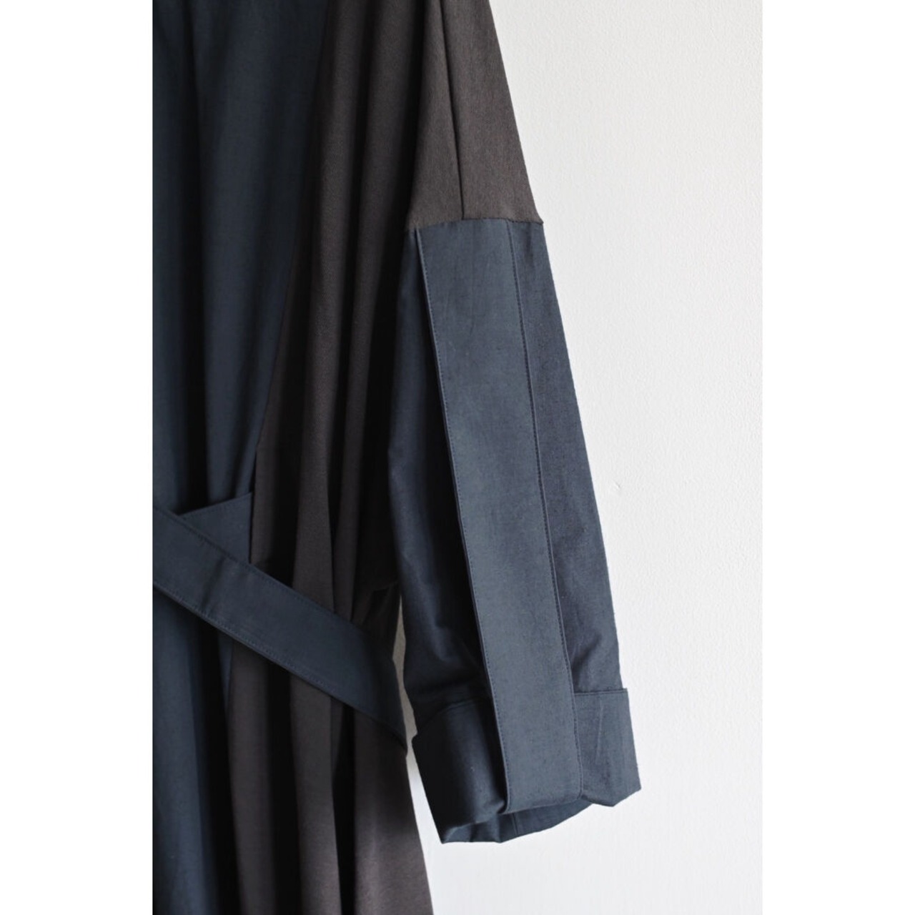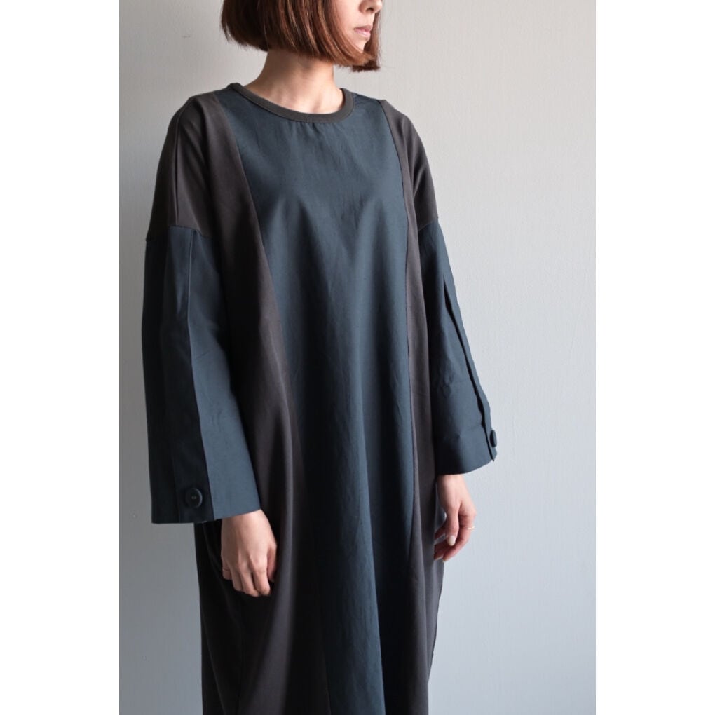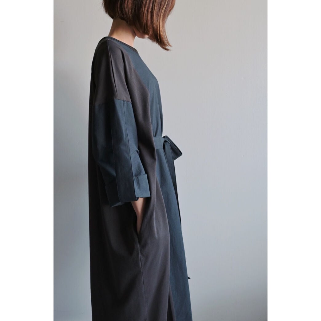 しっとり落ち感のあるカットソー生地と、風合いの良いコットンリネンの生地をミックスして作ったワンピース。フロントの接ぎ目は共布のベルトを通せるようになっていて、シルエットを変えられます。フロントだけベルトで絞ることで綺麗なドレープが出て独特のニュアンスがでます。袖は内側にボタンがついたロールアップ構造。袖をまくらずに着ることもできます。太めのベルト自体もデザインポイントになります。