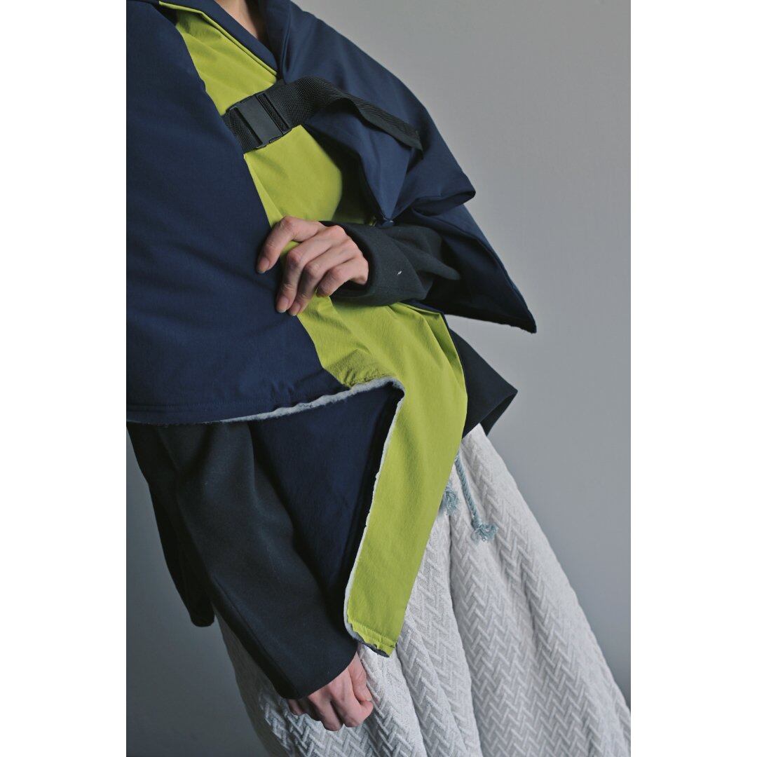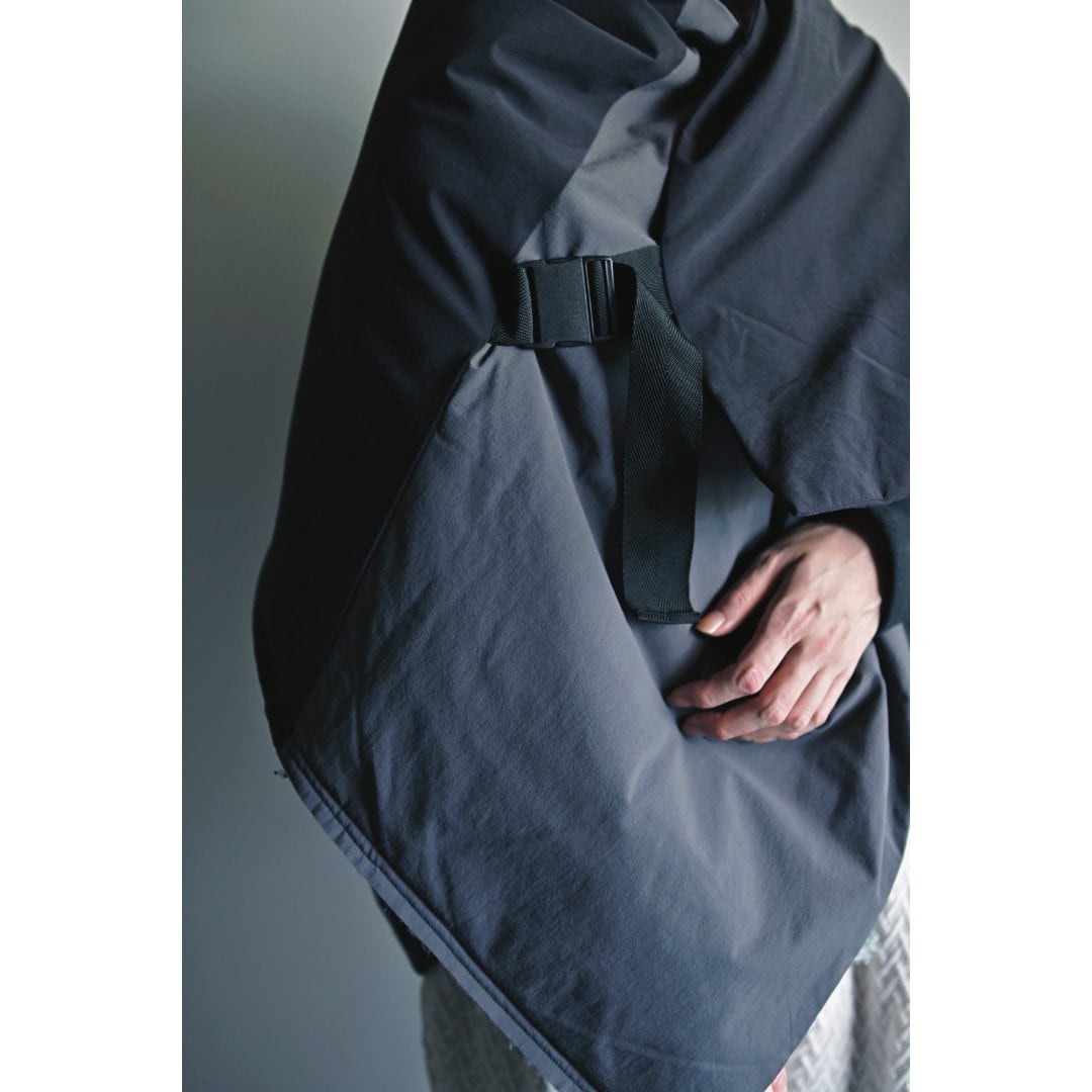 軽くて大判なストールは簡単なアウター代わりに使えてとても便利。内側にスナップボタン、外側にバックル付きのストラップで調整が可能。