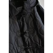 ミリタリーキルト素材をベースにダッフルコートのディティールを組み合わせたインパクトのある一着です。ロング丈、Aラインシルエット、前振りをつけたドロップショルダーで女性らしいフォルムに仕上げました。衿元やパイピングはコーデュロイを使用しています。リアルホーントグルを使用、トグル下にはドットボタンも備えているので、防風性も向上させています。
