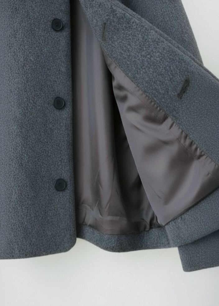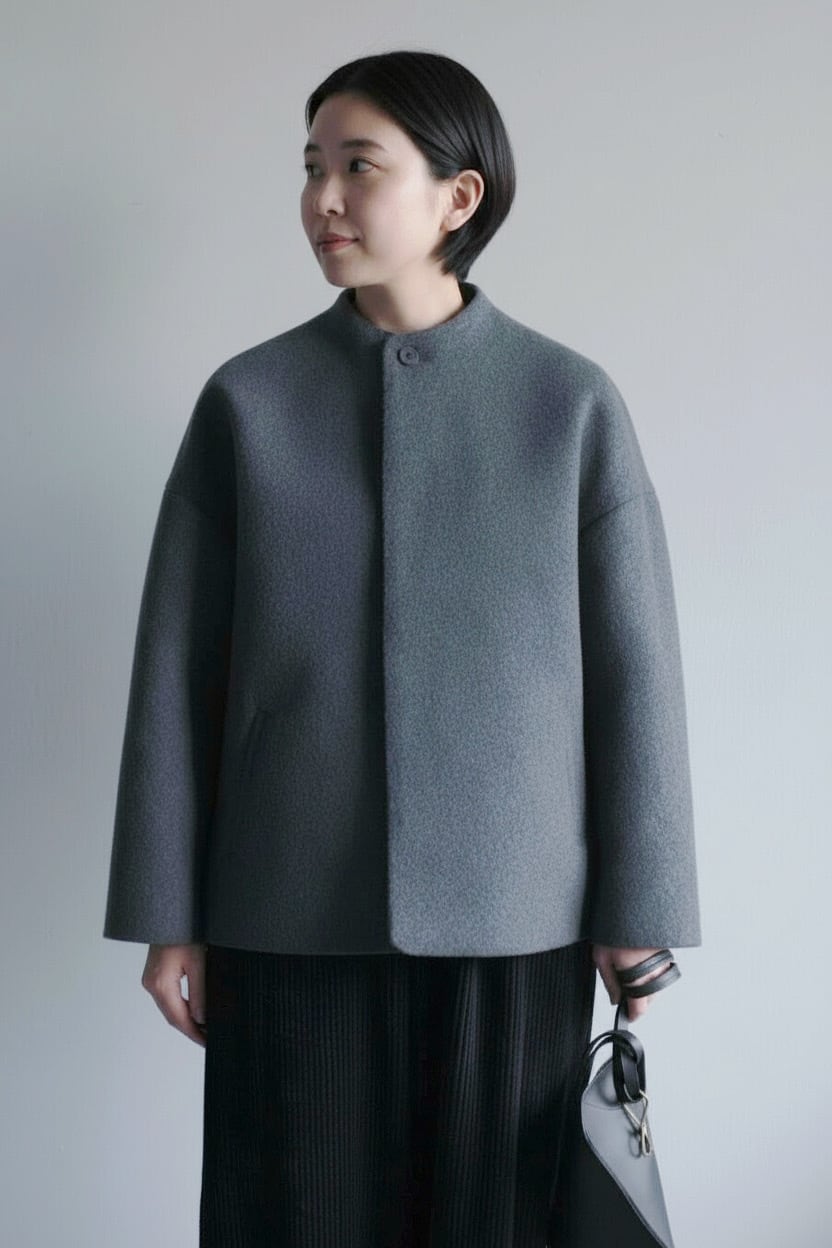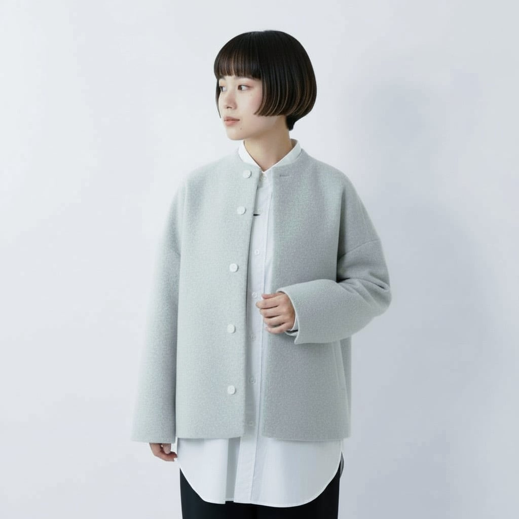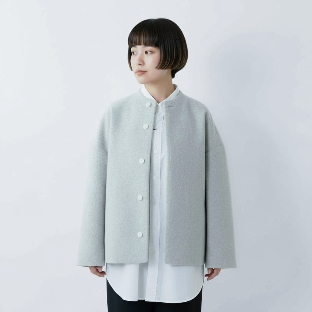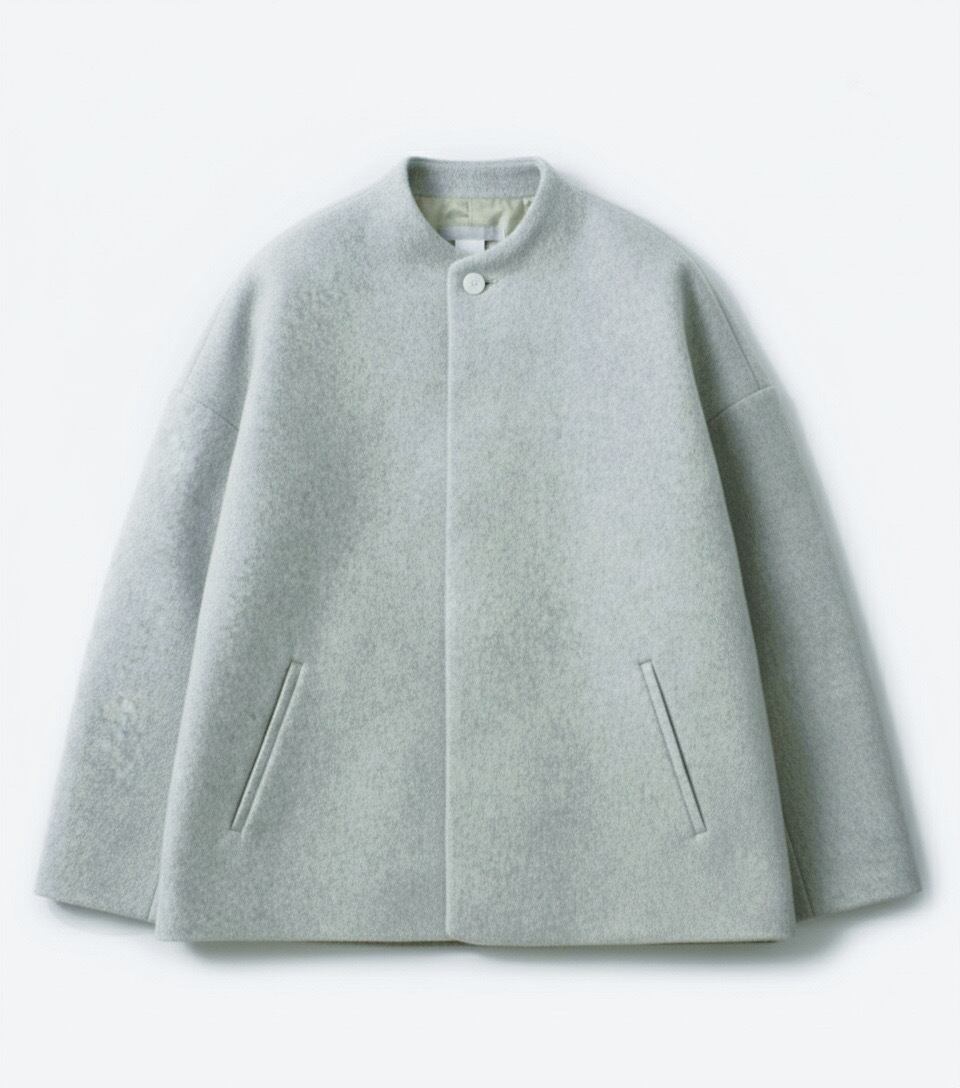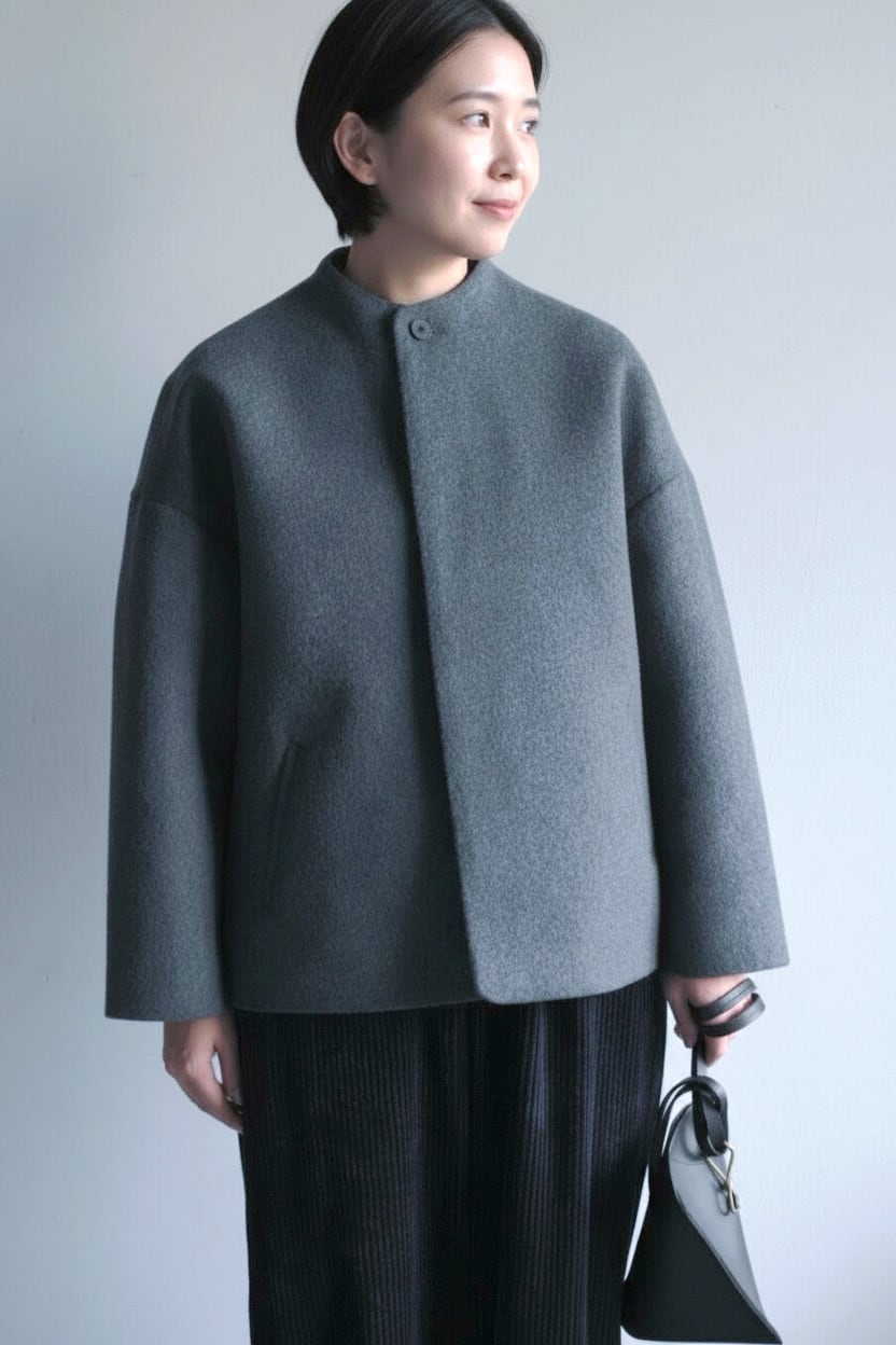 毛足の長いメルトン生地を使用した、品のあるボトルネックブルゾンです。 上質なスーパー100's ウールショートビーバーが、柔らかく快適な着心地を提供します。襟ぐりは首に沿って少し立ち上がったボトルネックで洗練されたシルエットを演出します。また、前立ては比翼ボタン仕様で、細部までこだわったディテール。袖口と後裾にはスリットが施され、動きやすさとスタイルの両方を実現しています。全面芯ボンディングと総裏仕立てで、保温性と高級感を兼ね備えた一着です。