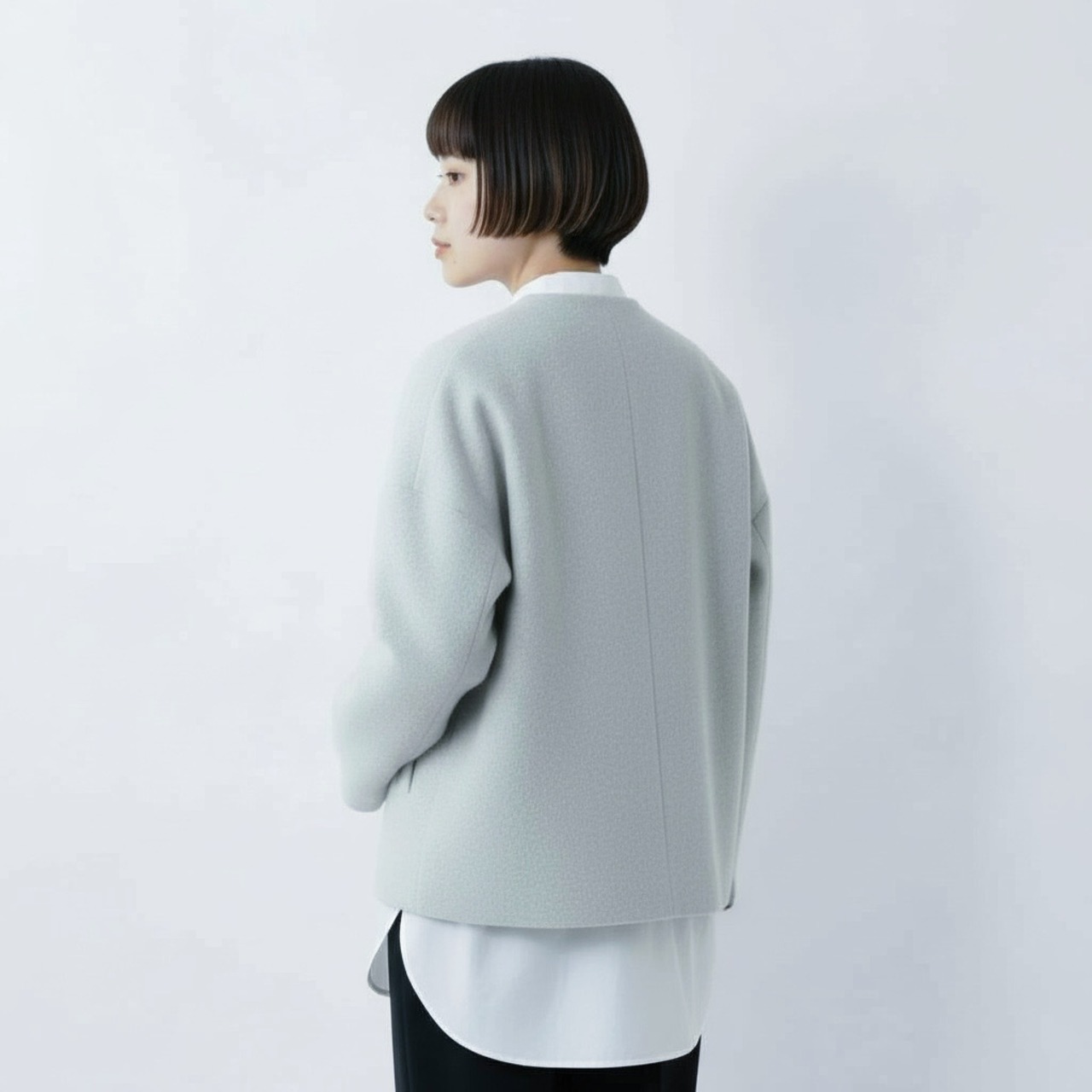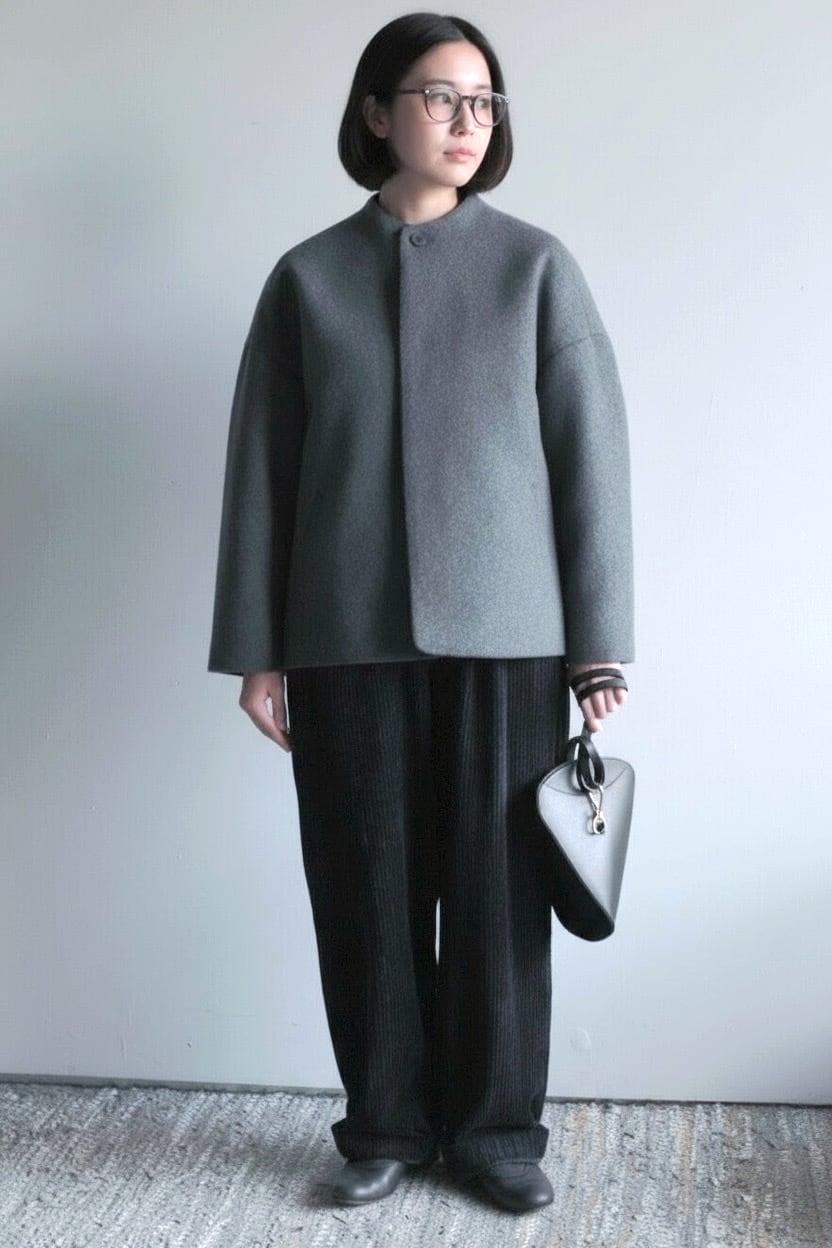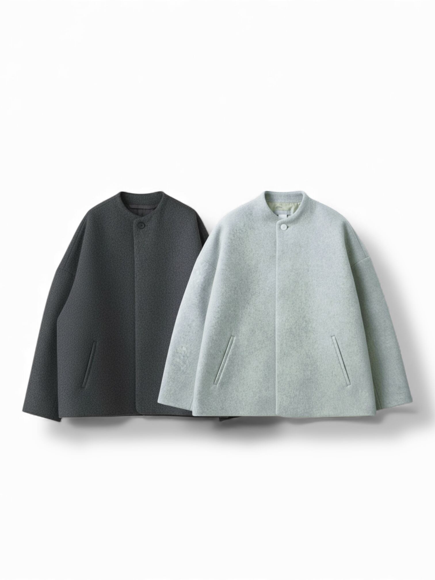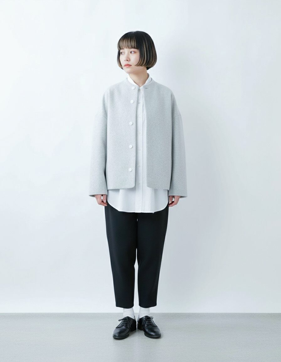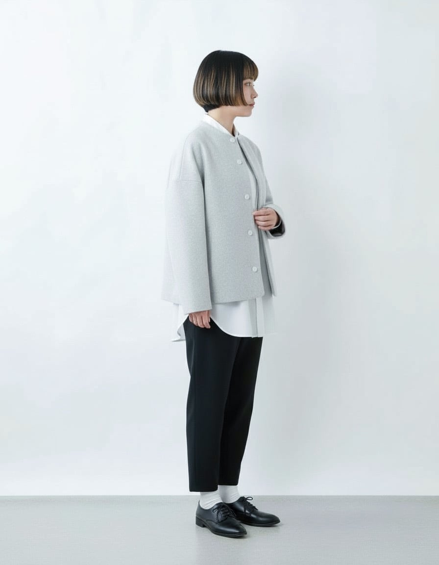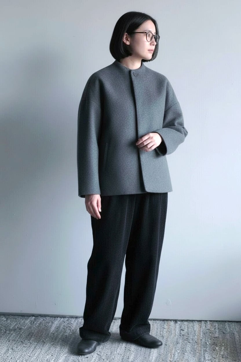 毛足の長いメルトン生地を使用した、品のあるボトルネックブルゾンです。 上質なスーパー100's ウールショートビーバーが、柔らかく快適な着心地を提供します。襟ぐりは首に沿って少し立ち上がったボトルネックで洗練されたシルエットを演出します。また、前立ては比翼ボタン仕様で、細部までこだわったディテール。袖口と後裾にはスリットが施され、動きやすさとスタイルの両方を実現しています。全面芯ボンディングと総裏仕立てで、保温性と高級感を兼ね備えた一着です。