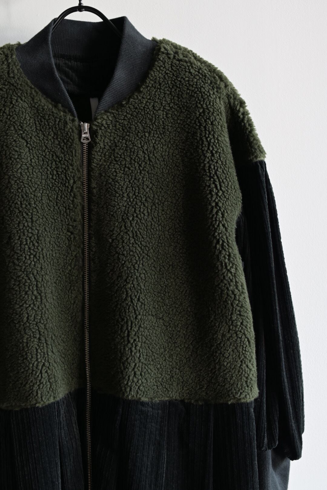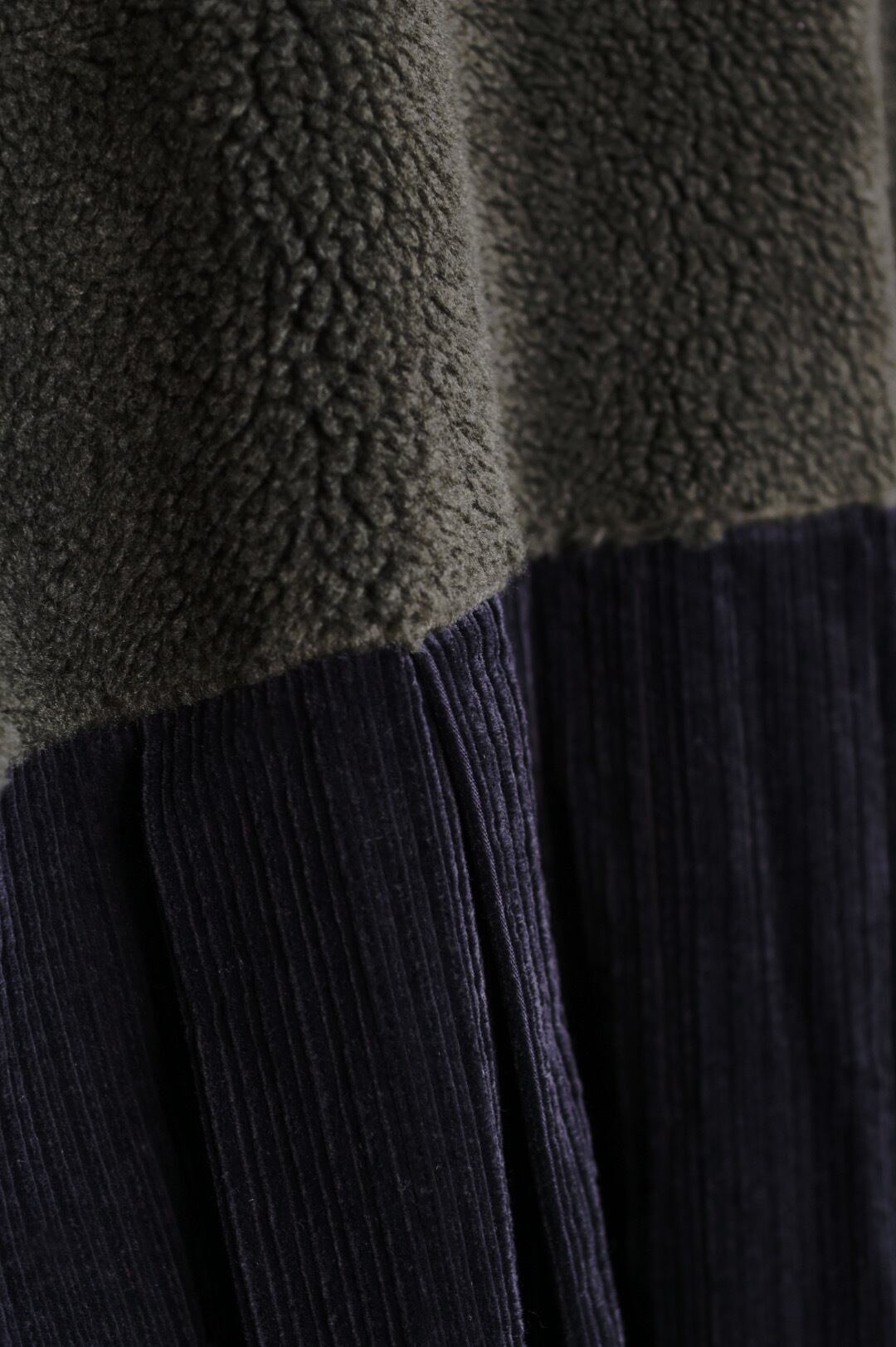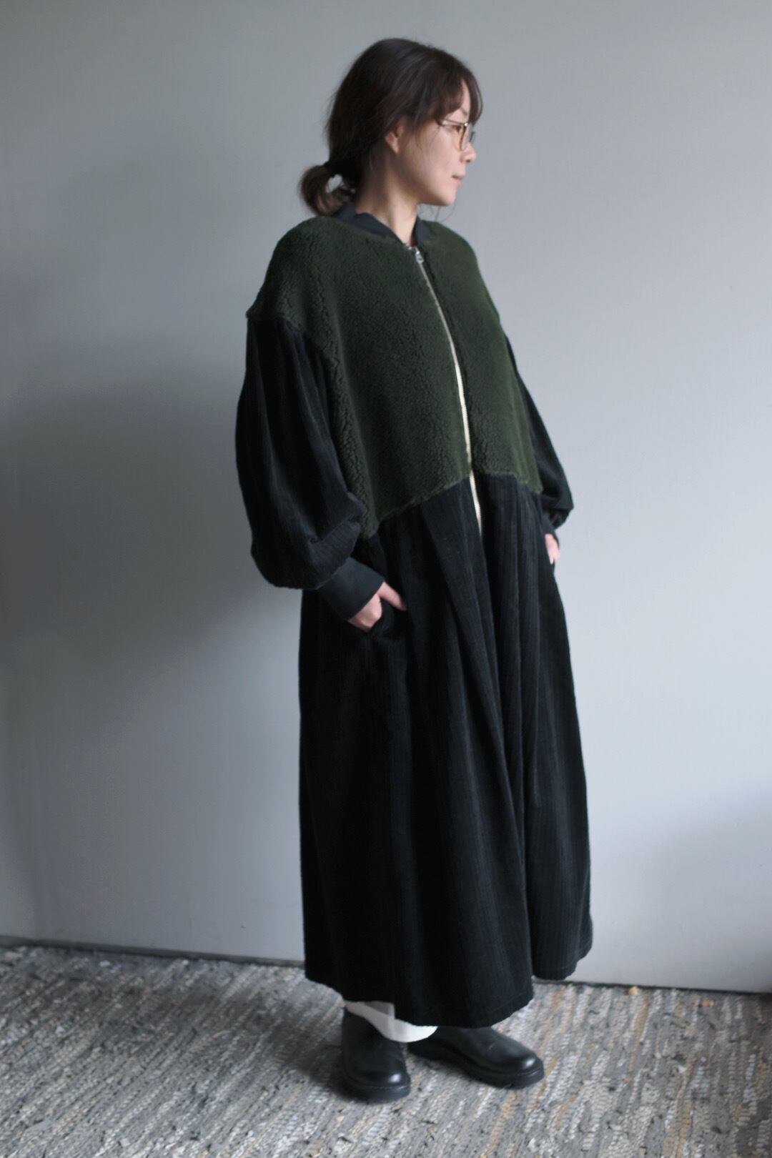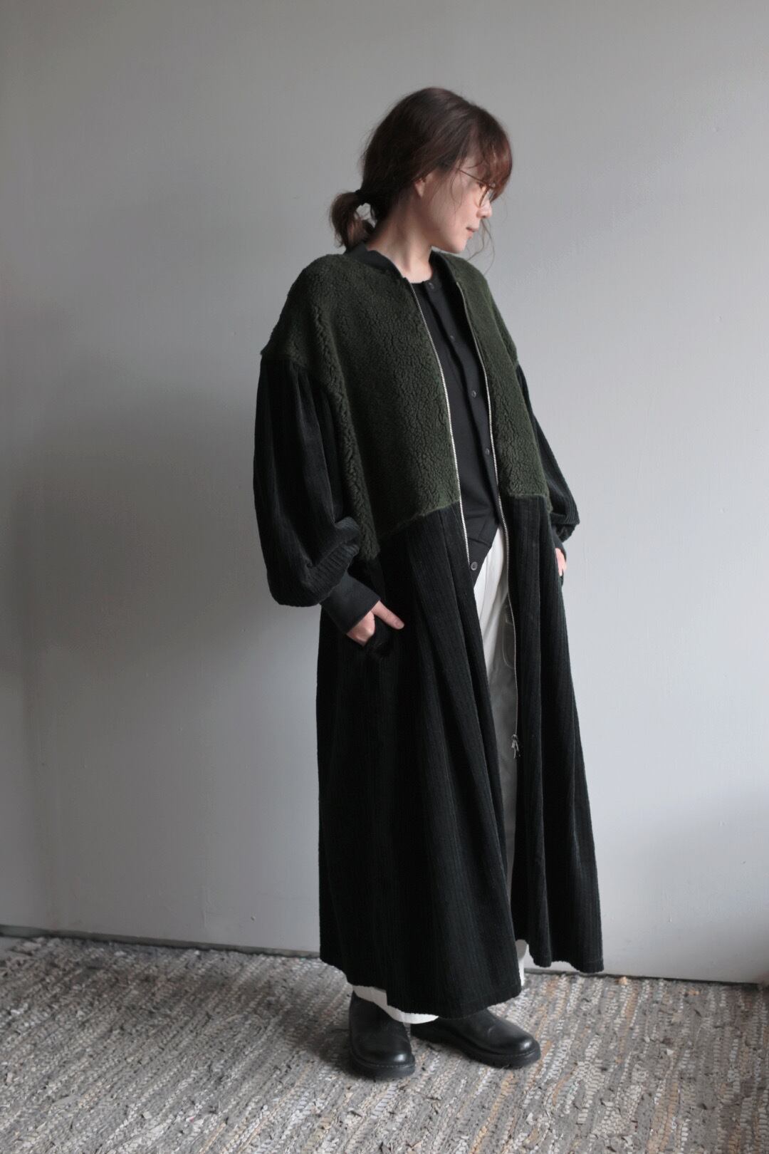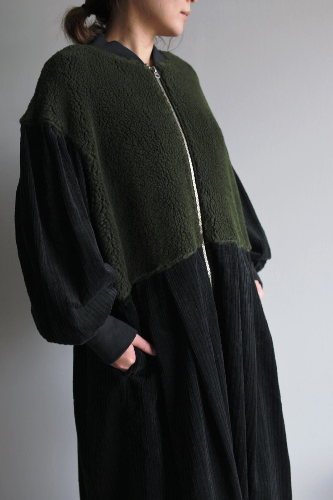 トスカーナボアと太畝と細畝が交互に並んだコーデュロイ素材を切り替えしたデザインが魅力のジップコート。ワンピース感覚で着用できコートとして羽織ることもできる多様性のあるアイテム。