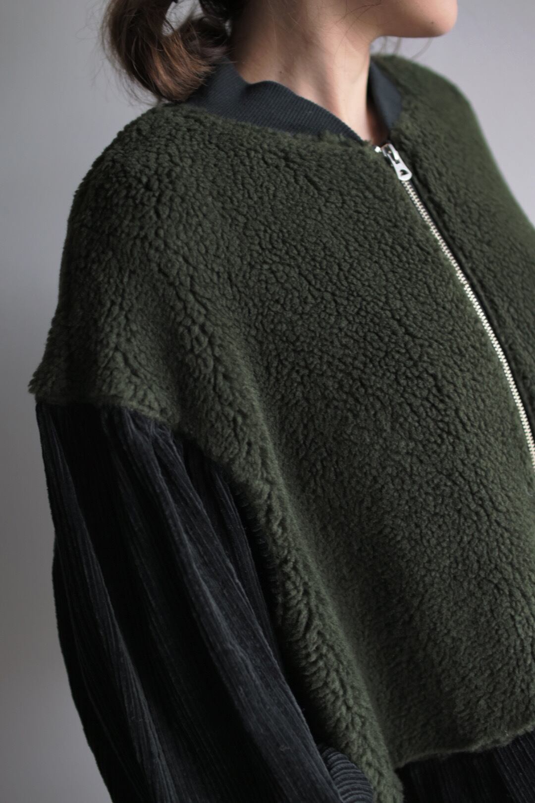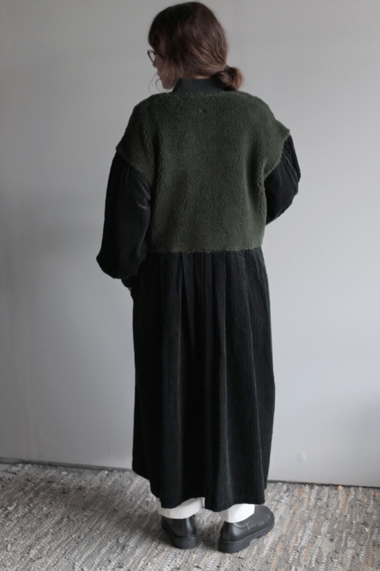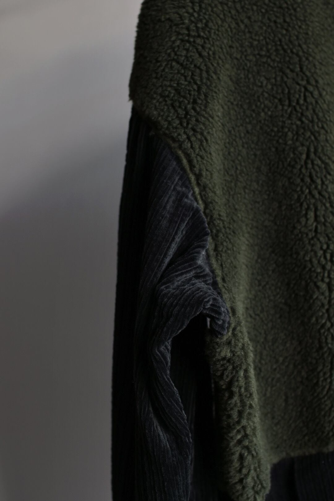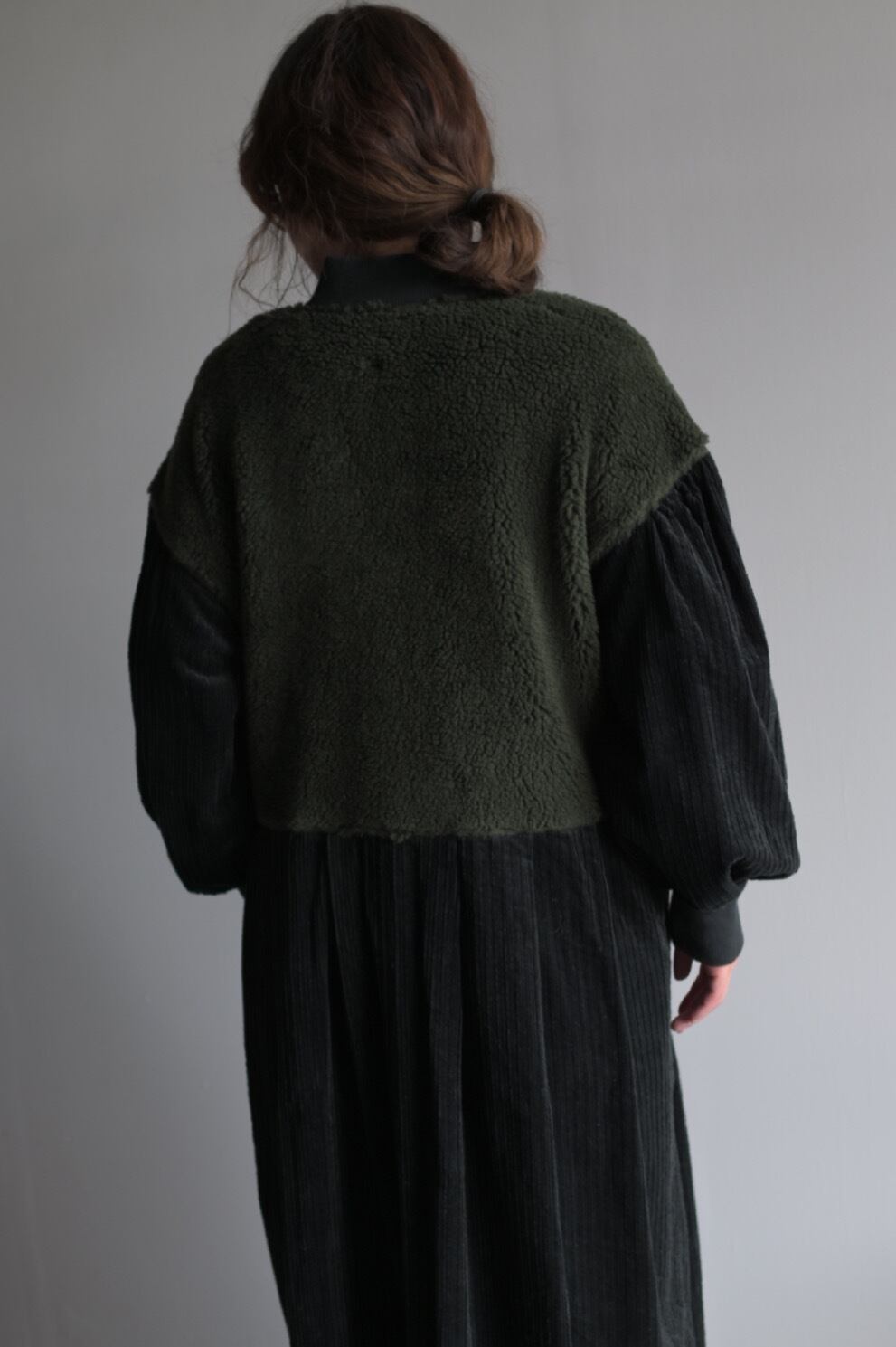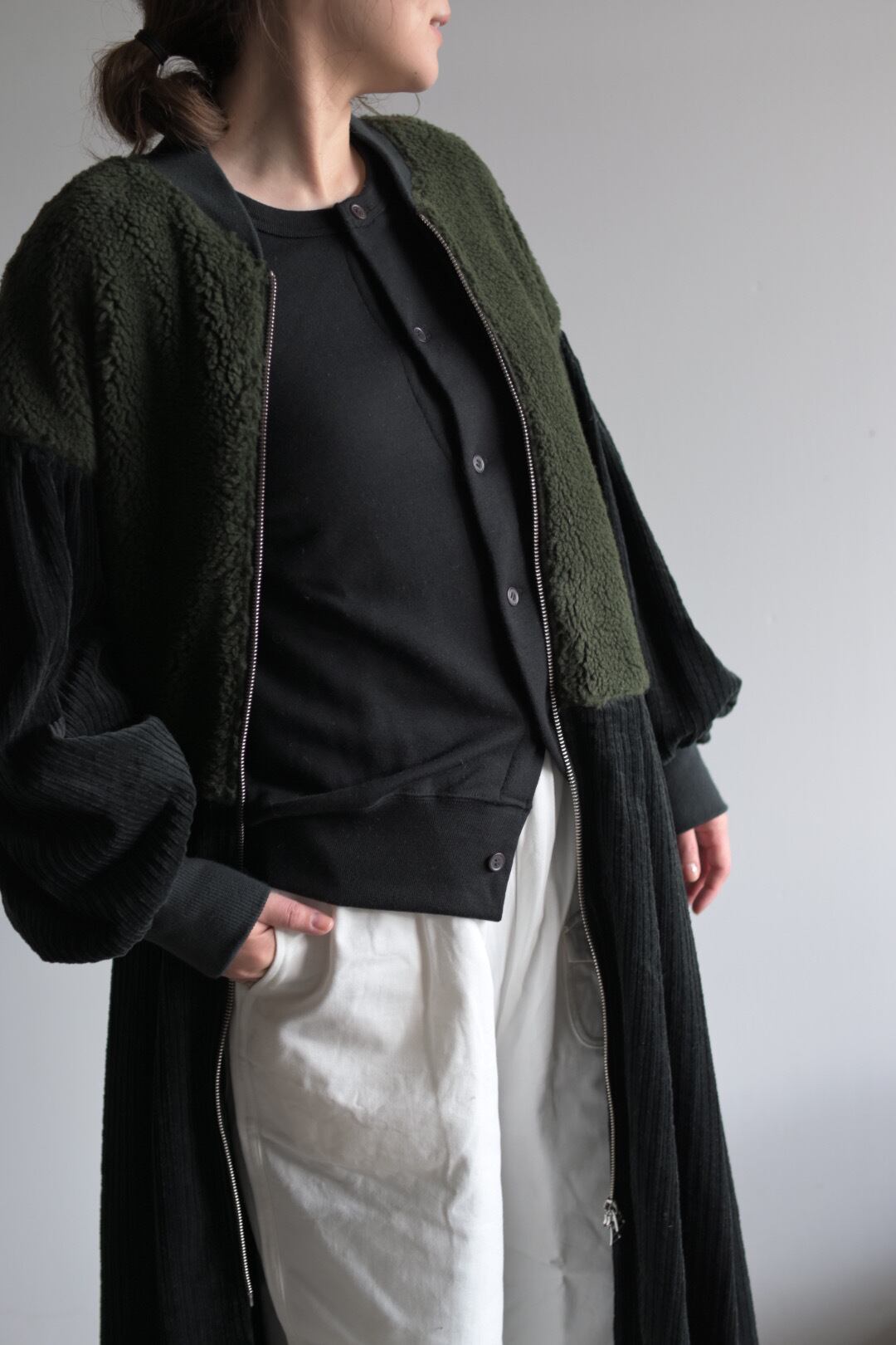 トスカーナボアと太畝と細畝が交互に並んだコーデュロイ素材を切り替えしたデザインが魅力のジップコート。ワンピース感覚で着用できコートとして羽織ることもできる多様性のあるアイテム。