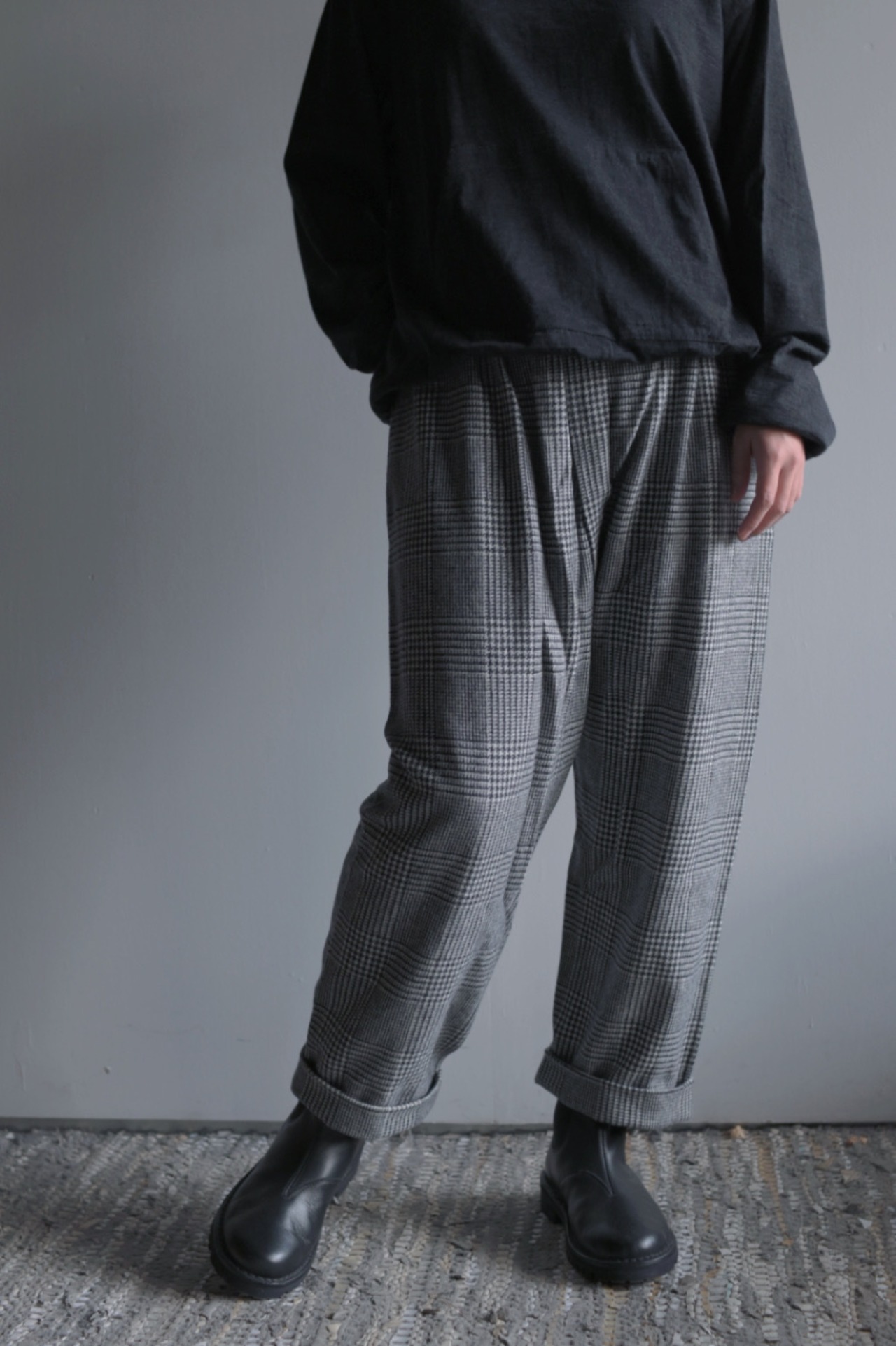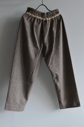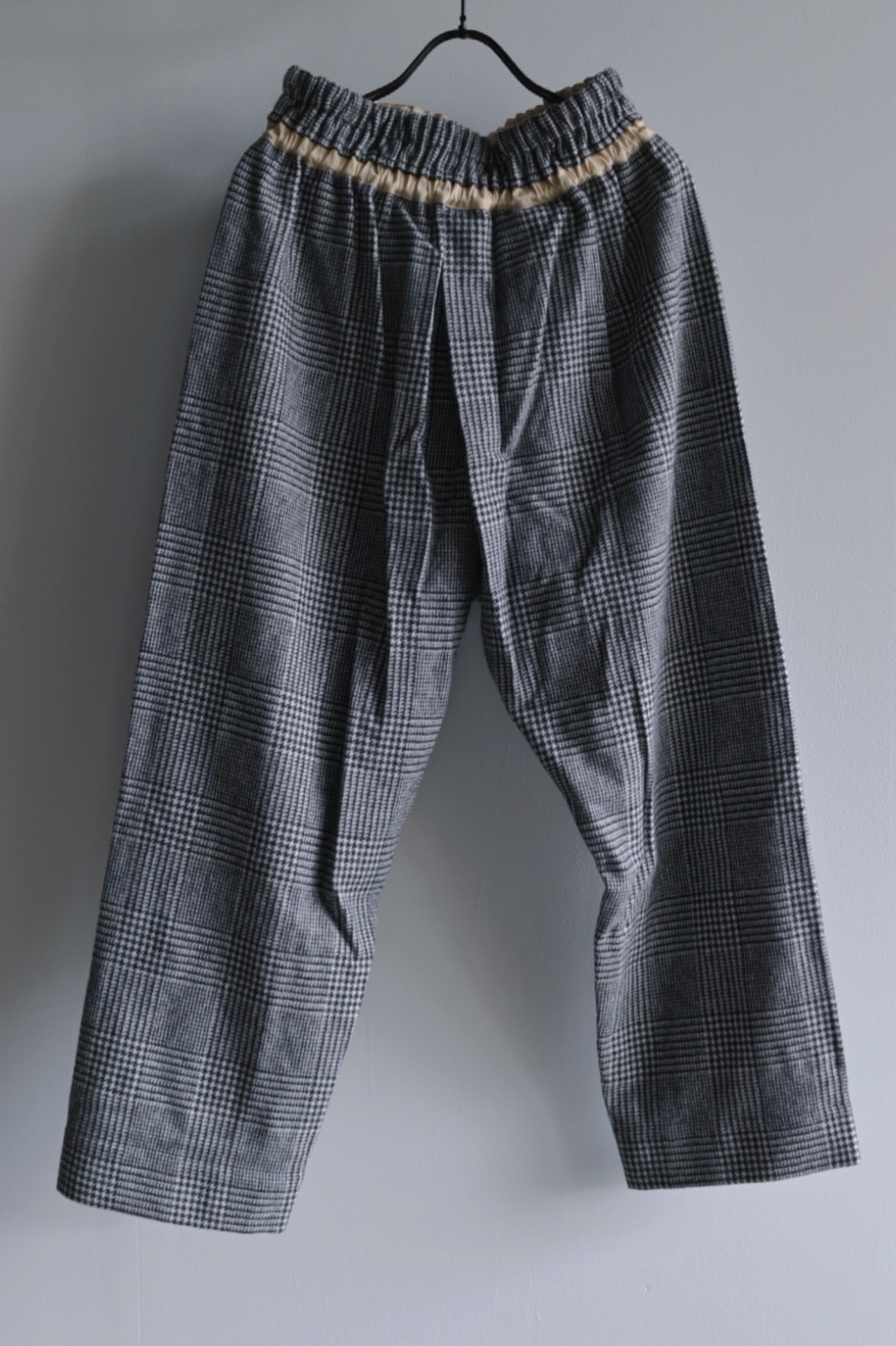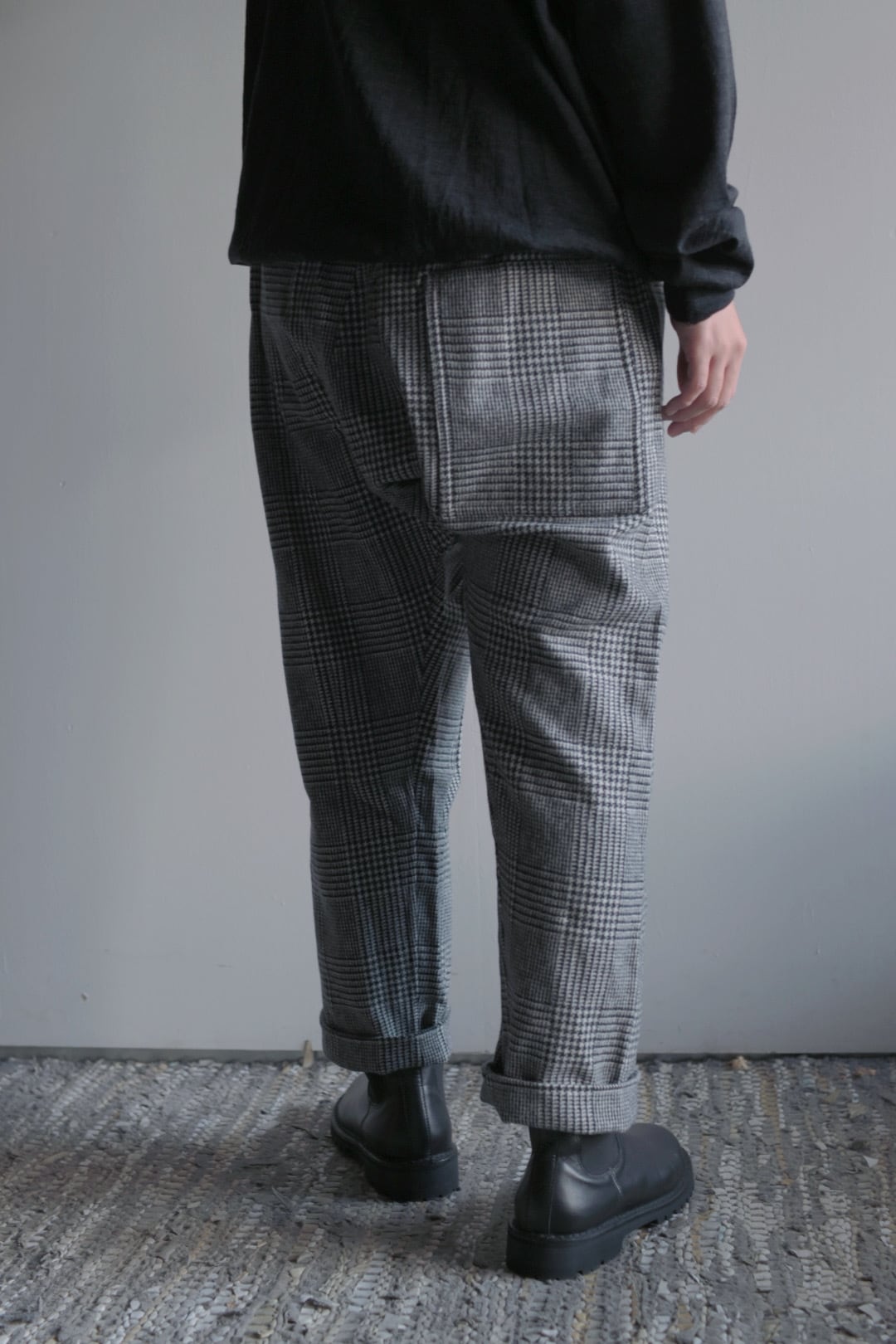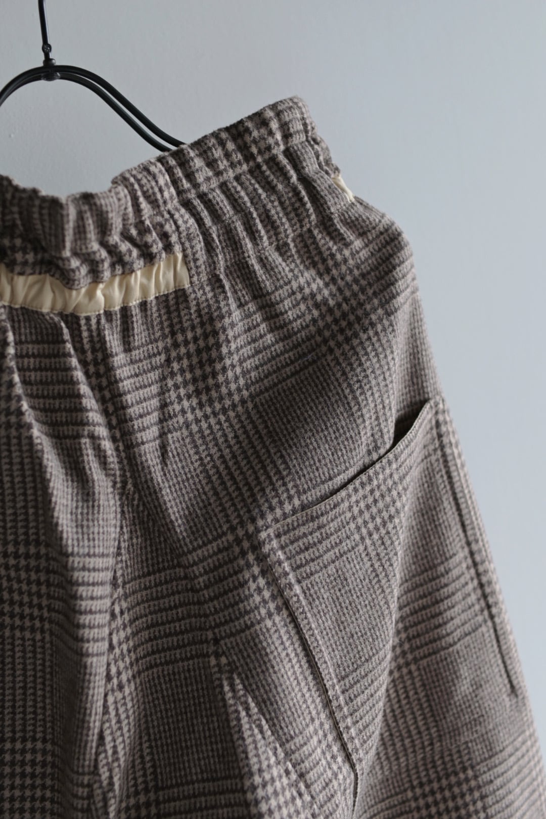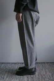 柔らかく暖かな着心地が魅力。裏地無しですがチクチク感のない滑らかな質感です。気品のあるグレンチェック柄に遊び心のあるパンツのシルエットが新鮮。リラックス感のある着心地と独特なシルエットは中毒性があります。お気をつけて。
