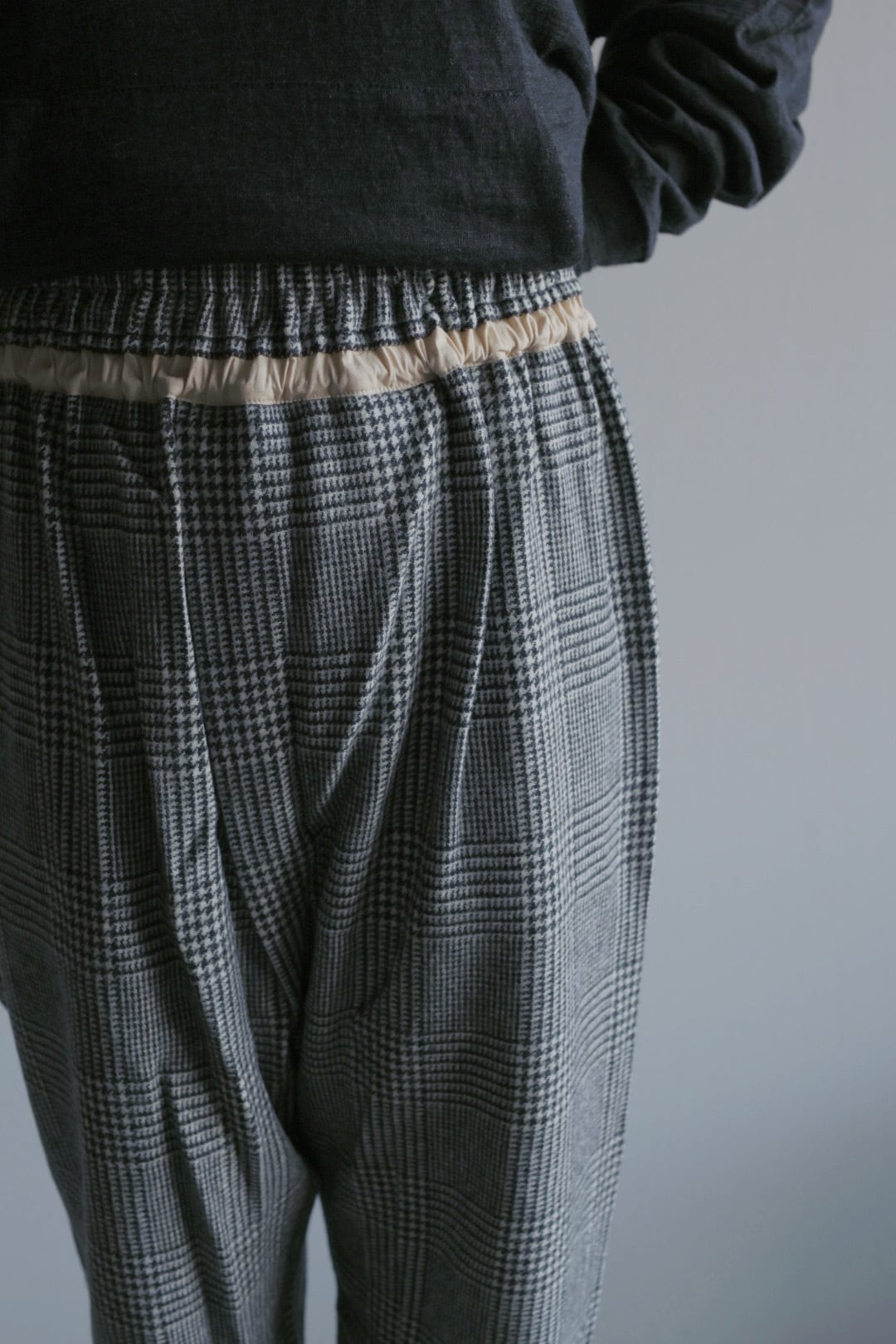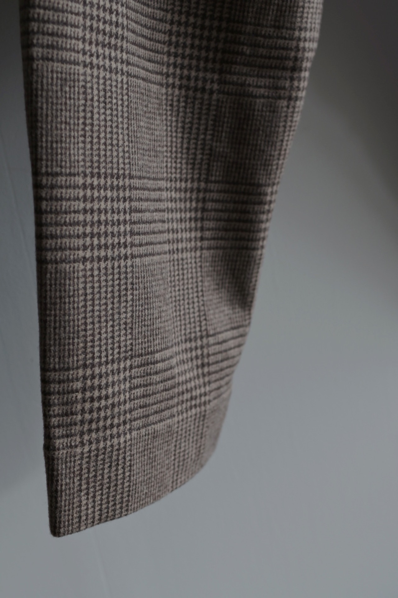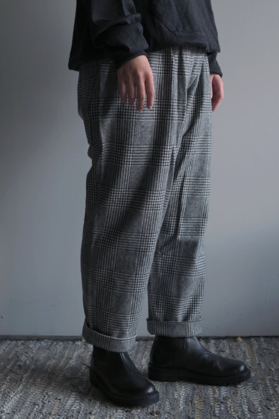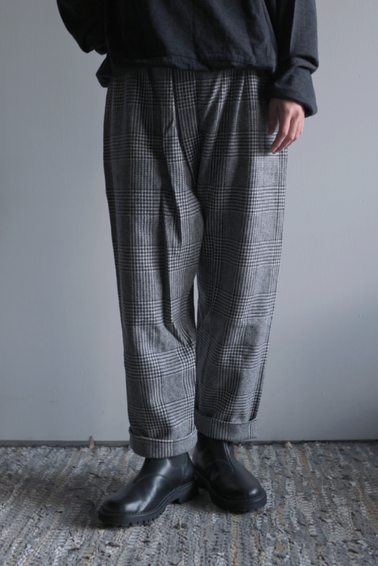 柔らかく暖かな着心地が魅力。裏地無しですがチクチク感のない滑らかな質感です。気品のあるグレンチェック柄に遊び心のあるパンツのシルエットが新鮮。リラックス感のある着心地と独特なシルエットは中毒性があります。お気をつけて。