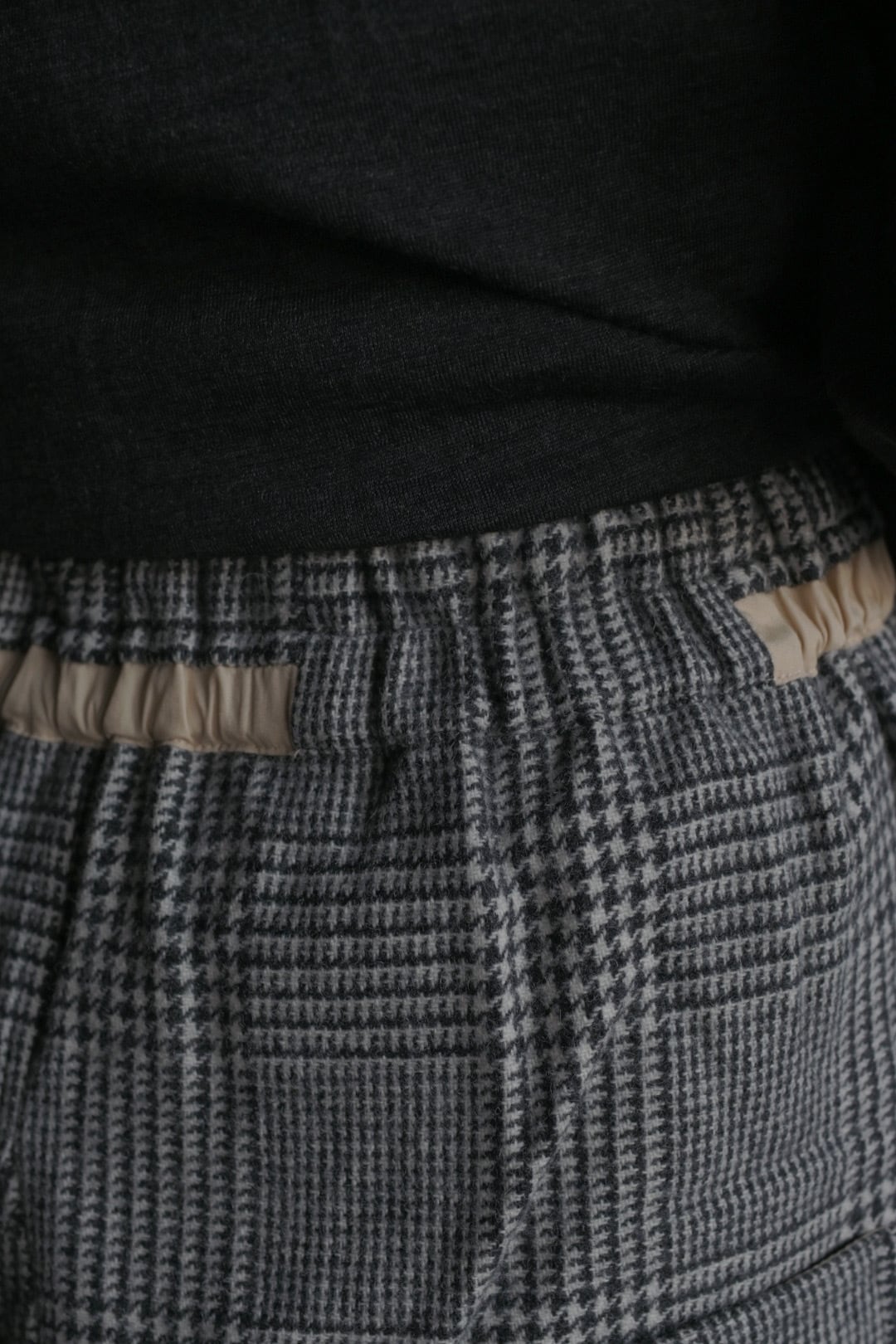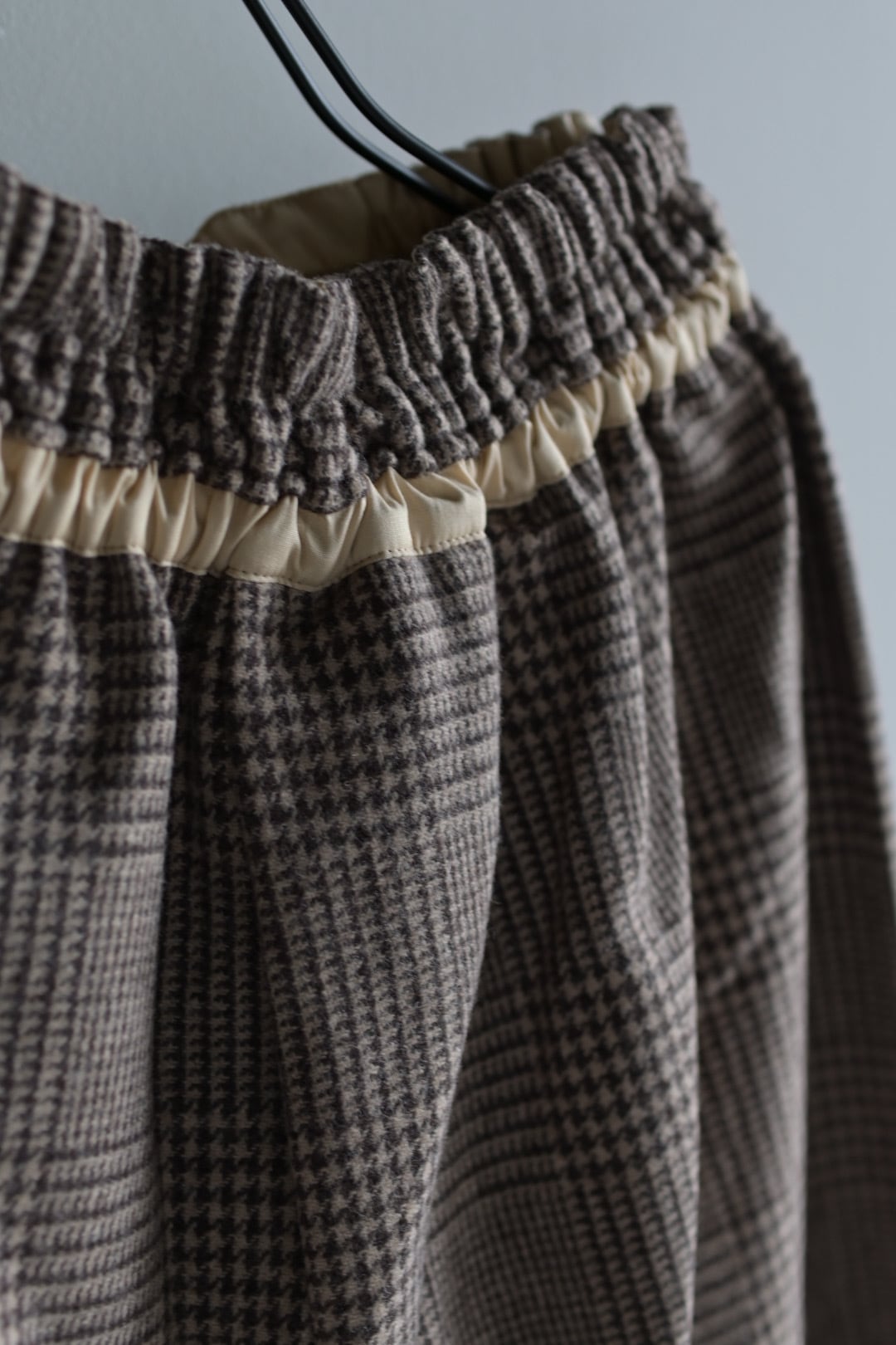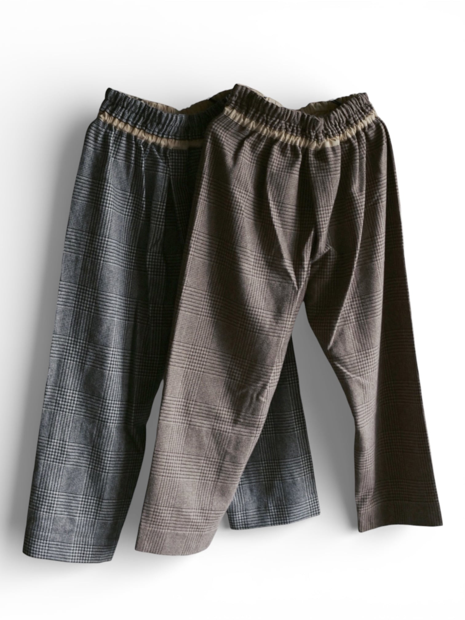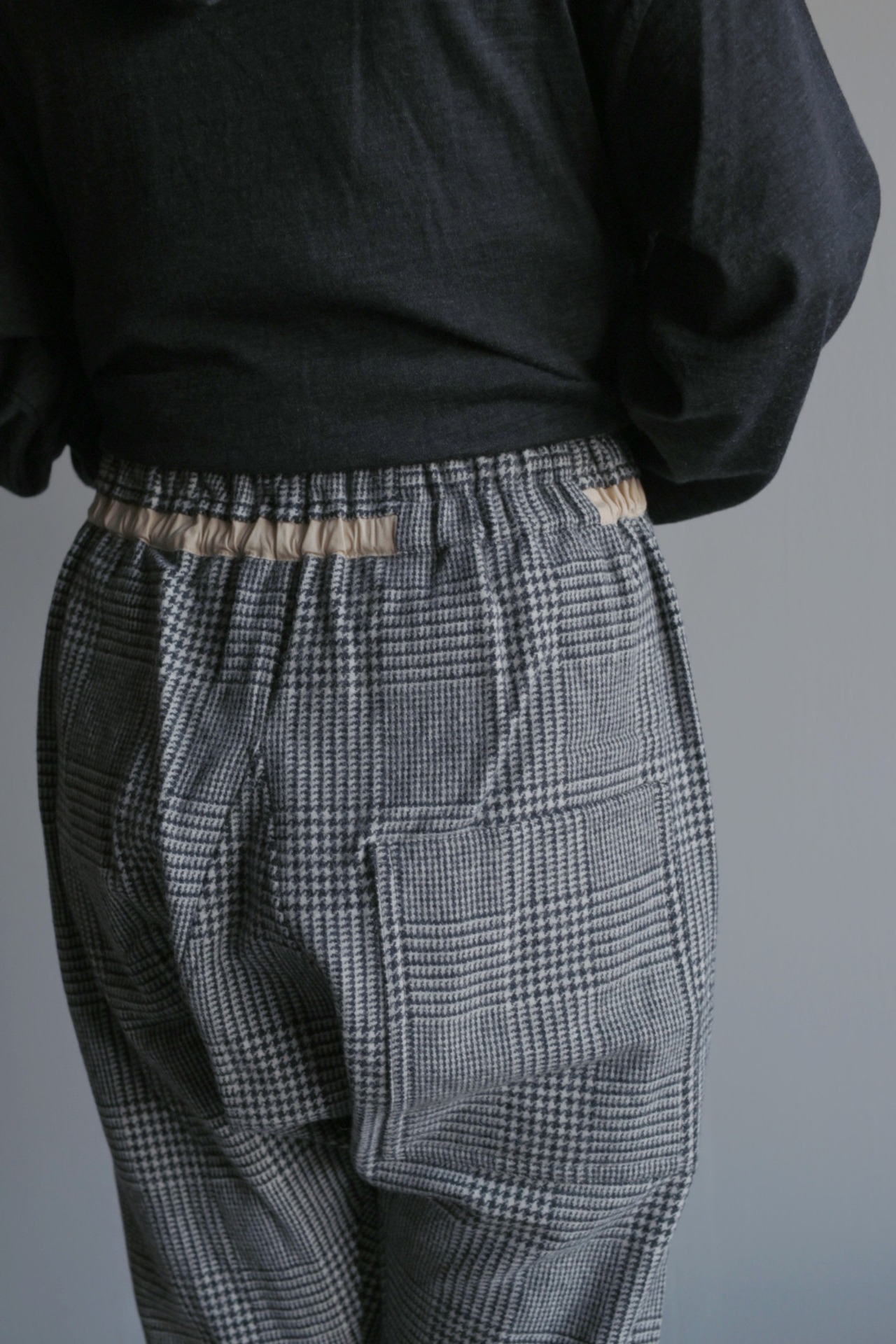 柔らかく暖かな着心地が魅力。裏地無しですがチクチク感のない滑らかな質感です。気品のあるグレンチェック柄に遊び心のあるパンツのシルエットが新鮮。リラックス感のある着心地と独特なシルエットは中毒性があります。お気をつけて。