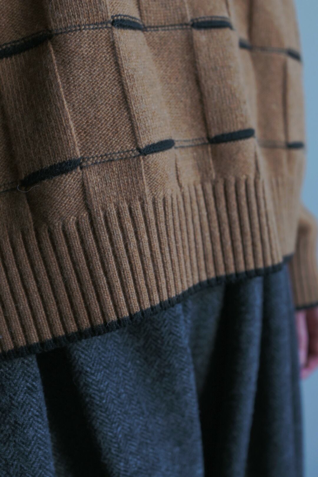 表編みと裏編が交互に表れる立体感のある編地にさらに配色のラインが入っていてシンプルながら印象的な一着。