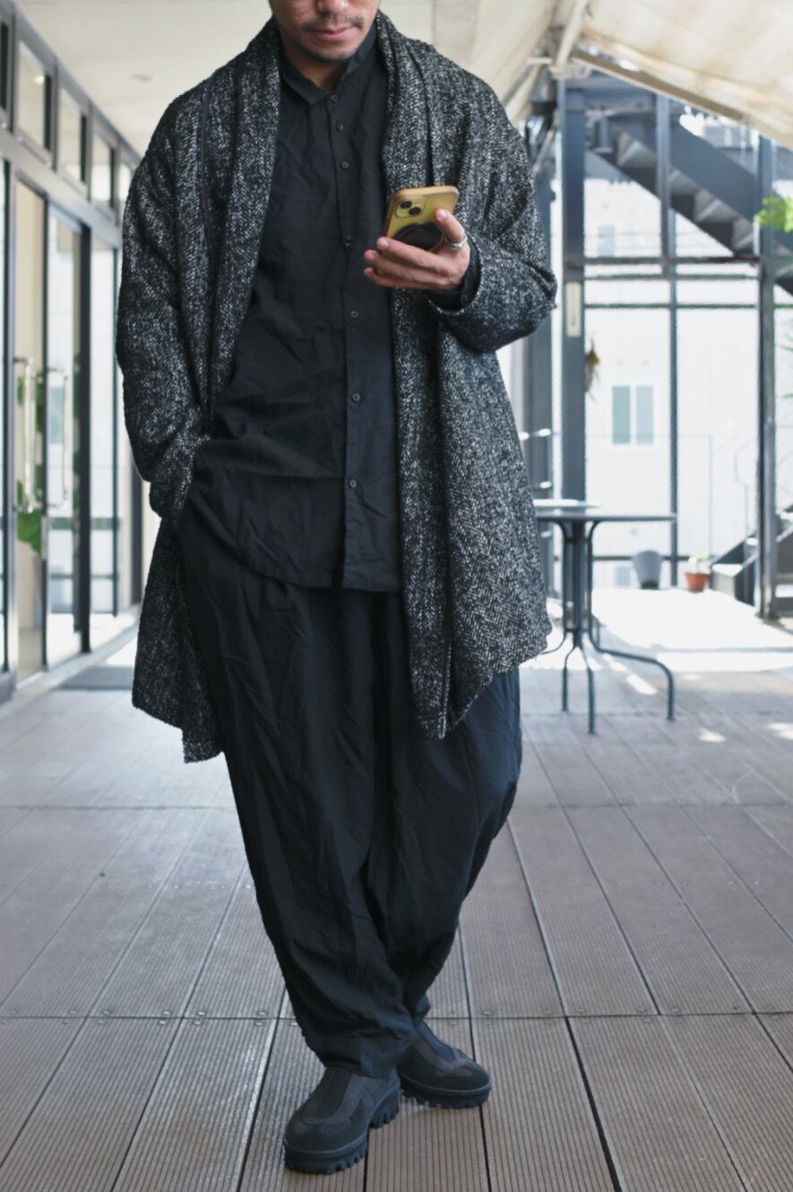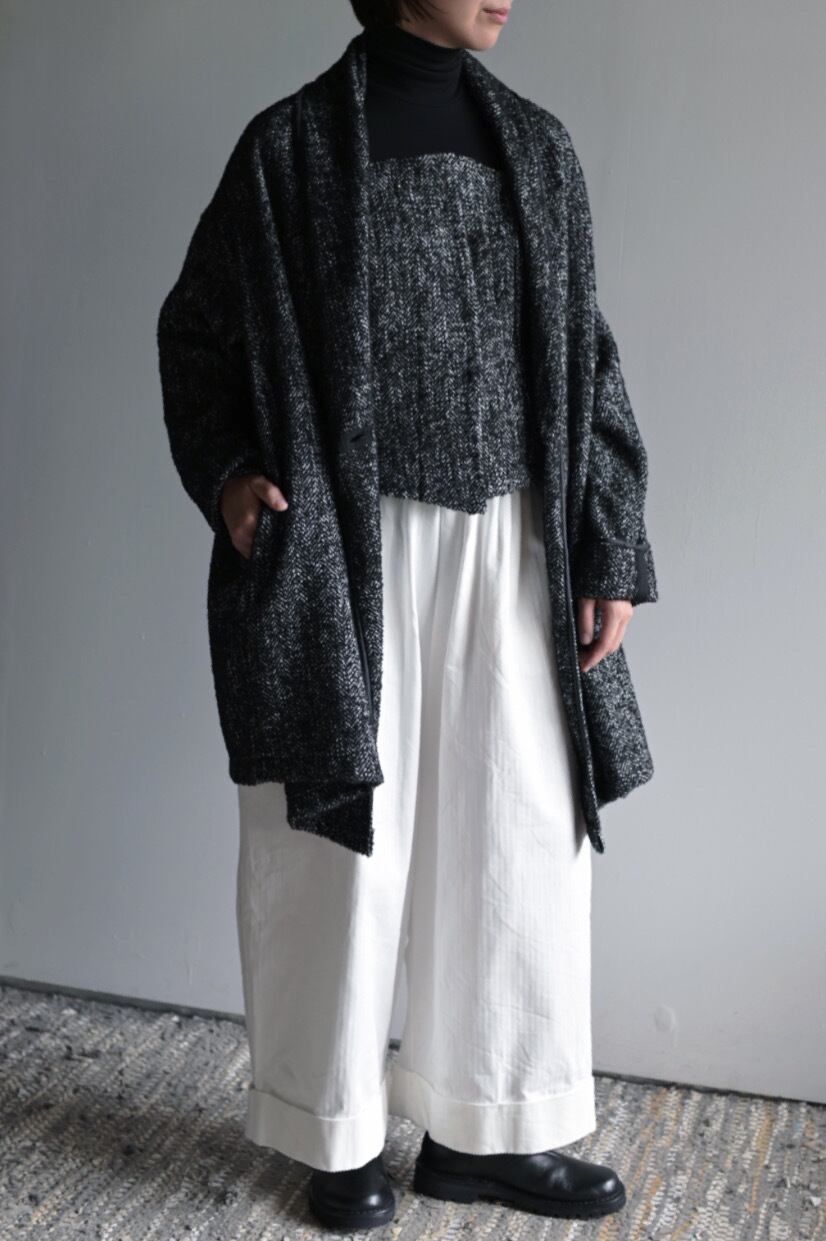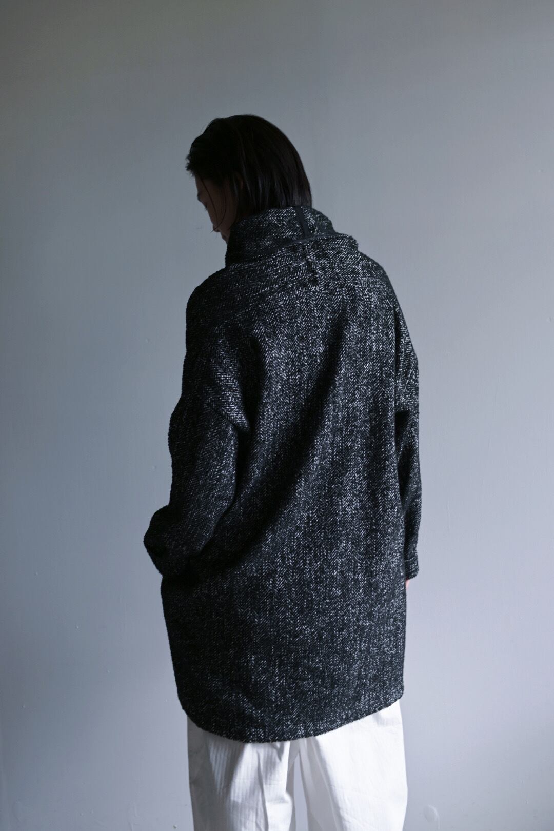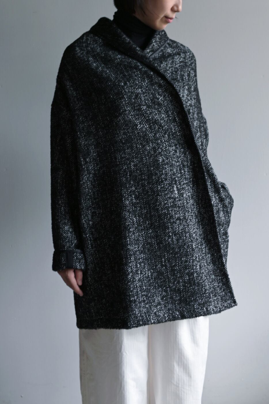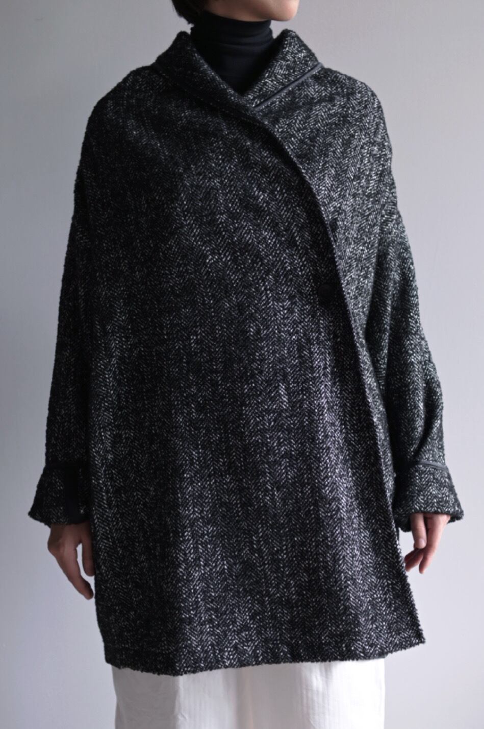 軽やかで柔らかなポリエステルツイードを使用した、シックでエレガントなミドル丈のガウンジャケットです。ヘリンボーンツイードの美しい織り目が、シンプルながらも洗練された印象を与えます。日常使いはもちろん、特別な場面でも活躍する一着。 シンプルなデザインながら、着る人のスタイルに寄り添い、さまざまなコーディネートにマッチします。リラックスしたシルエットなので、重ね着にも最適。