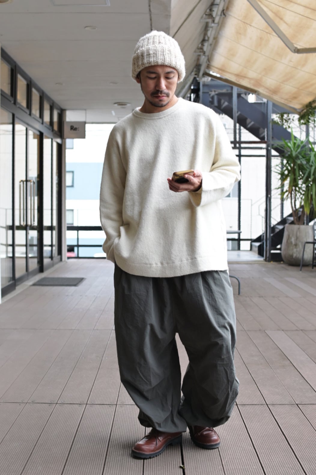 ミリタリーニットを再現したかのような生地の風合い。軽量で暖かくゆるめなシルエットが特徴的。